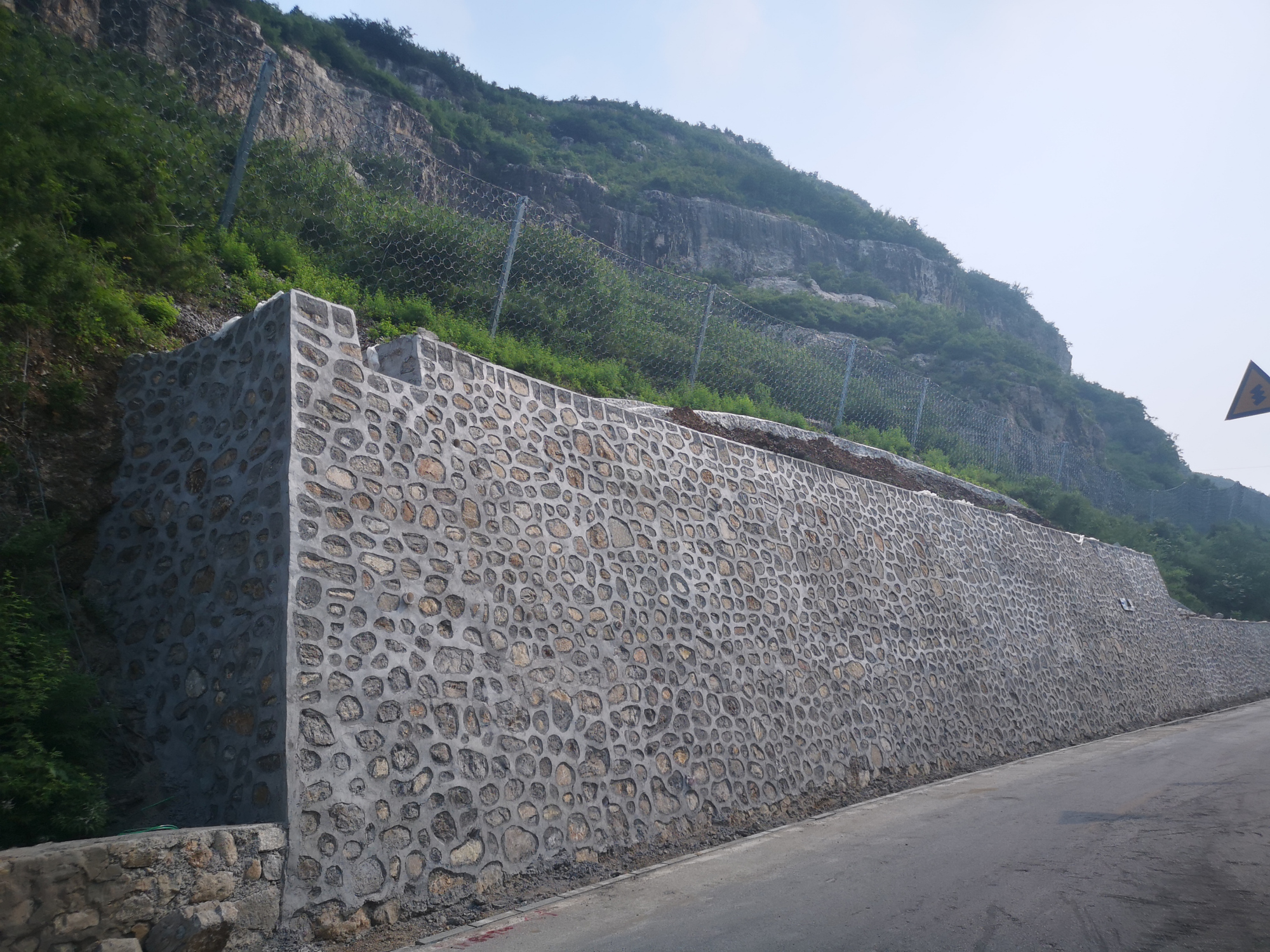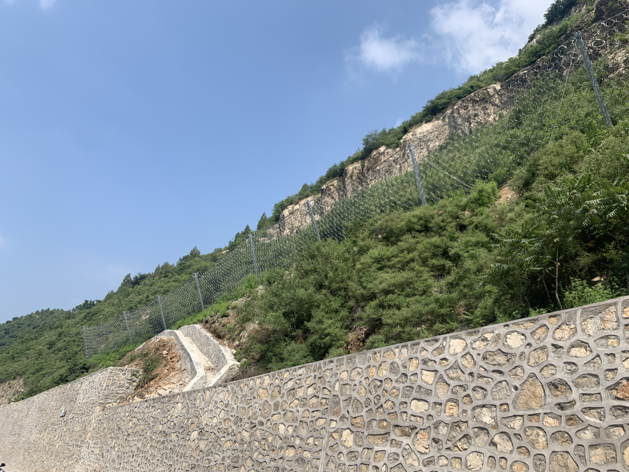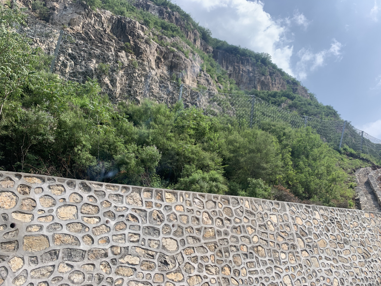 2022年6月3日,木邵路山体修复工程开工,工程施工范围为木孙路路口东1.3公里至密云界,主要施工内容为安装被动防护网、修建格构梁、修复并加高砌石挡墙,工程已于2022年7月20日主体完工。施工过程中,顺义公路分局在抓紧抓好工程安全质量、疫情防控工作的同时,注重环境保护,工程设计时选用格构梁中间填充生态袋的护坡施工工艺,高大挡墙墙顶下垂绿化减少墙体视觉枯燥感,在预防山体坍塌、落石的基础上兼顾绿化美化与水土保持。同时,分局要求施工过程中尽量减少山体开挖和对原有植被景观的破坏,躲避高大树木,以免造成水土流失或潜在的地质病害。