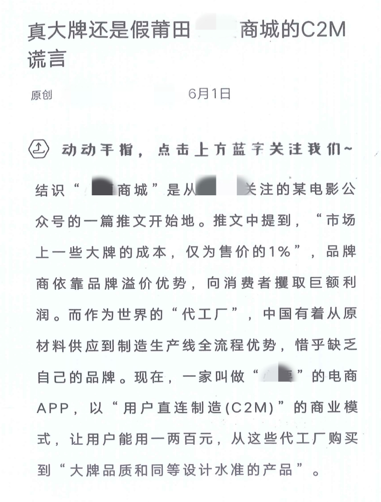 某商城凭借“用户直连制造(C2M)”的商业模式在众多网购平台中迅速崛起,并对外表示能够直连消费者和工厂,省去所有的中间流通环节,为用户提供大牌品质、平民价格的商品,实现用一两百元就能从代工厂买到与大牌品质和设计同等水准的产品。