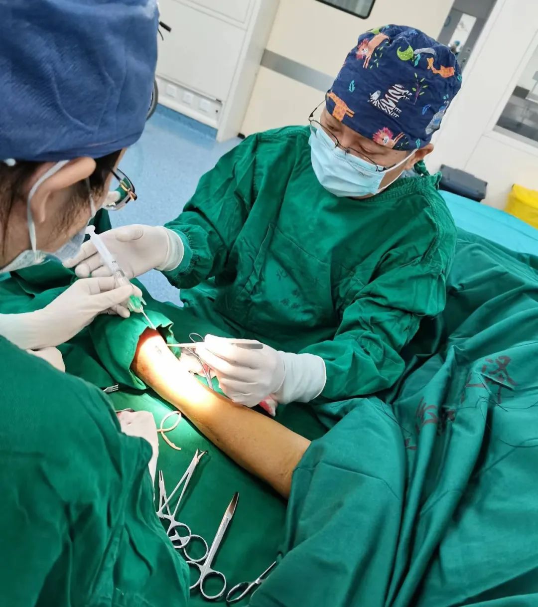 张东亮主任医师为患者行体动静脉瘘修补术2022年7月,王老因为透析时血压不稳定,最高可达200/120mmHg,再次前来就诊。张东亮主任医师带领病房管床大夫为王老进行了细致诊疗。“血压分布呈反勺型,胰腺内分泌腺瘤,左头臂静脉外伤后狭窄致左前臂内瘘侧肢体高静脉压综合症”,一周内肾内科团队与影像科团队一同明确了王老的疾病,随后的治疗便迎刃而解,王老的血压稳定了、血液透析中血压不再飙升了,各项临床指标良好。