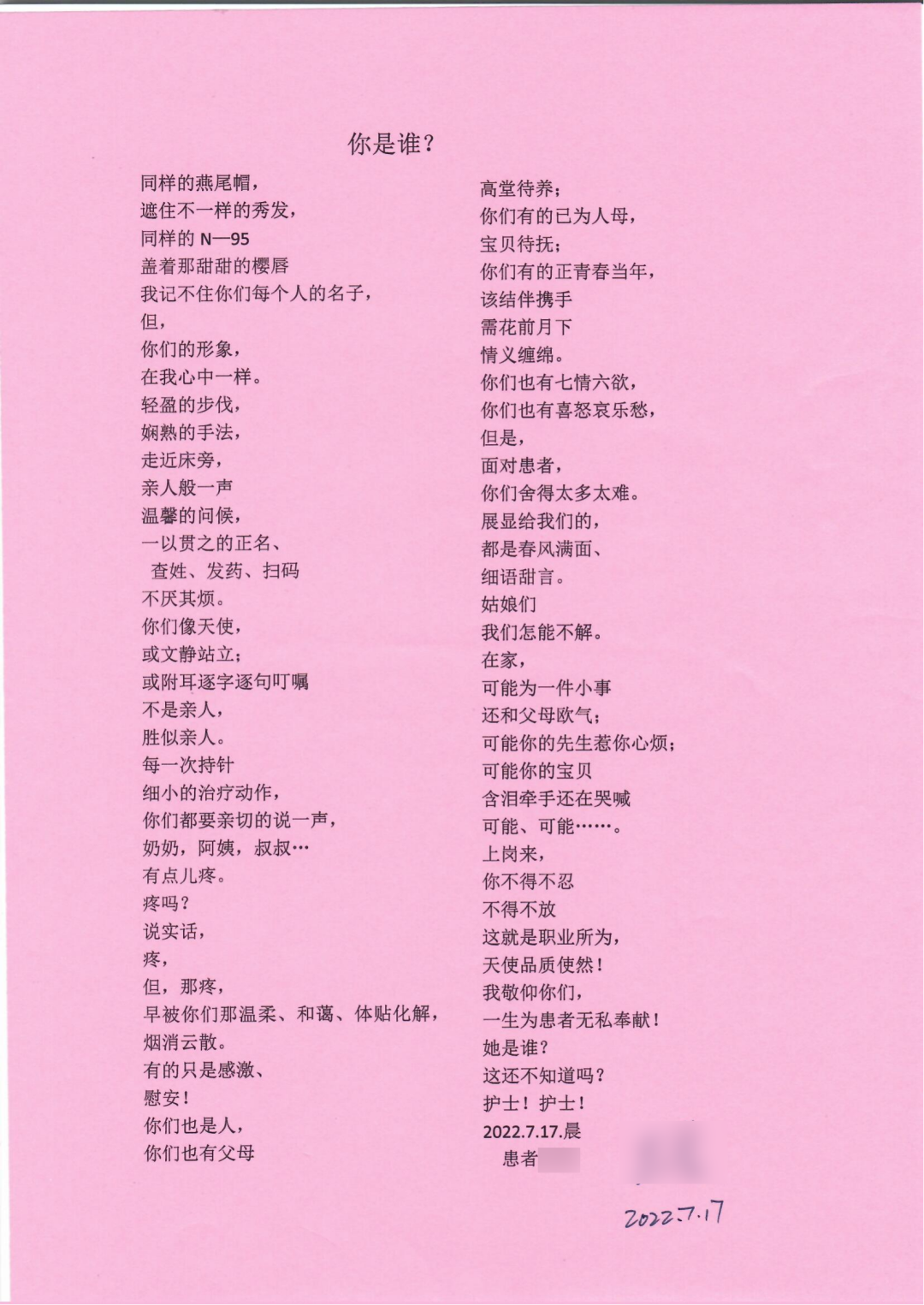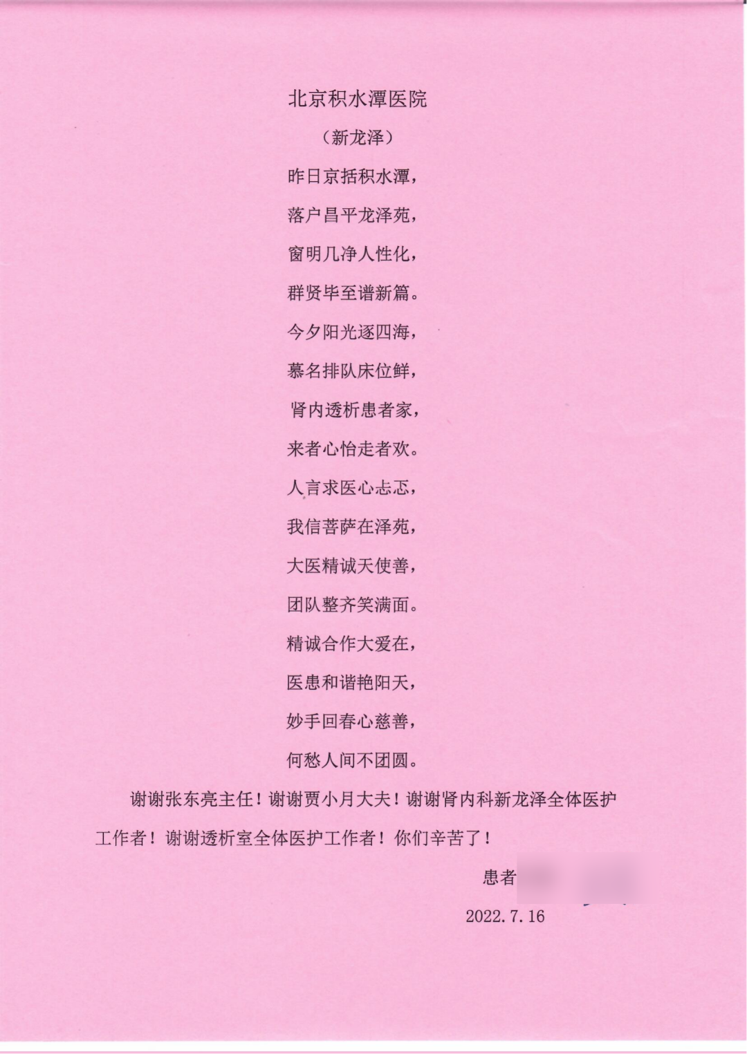 正是由于肾内科团队的精准治疗和精心照顾,王老不仅身体恢复了,困扰很久的心理包袱也卸下了。王老出院前高兴地即兴赋诗两首,赠予全体肾内科医务人员,这不仅是一位耄耋老人对肾内科的褒奖,更是北京积水潭医院深入开展人文医院建设的生动体现。