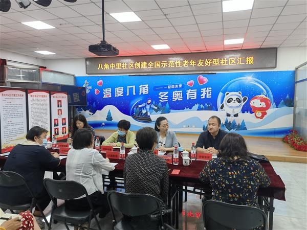 随后,专家组一行到八角街道八角南路社区开展创建工作实地考核,社区书记陈鹏全程陪同。专家组特别考察了社区孝老文化建设、老年人书法绘画活动、冬奥示范社区、公共文化服务中心等社区特色的建设工作,并对社区养老服务驿站、社区卫生服务站等实施进行了实地考核。