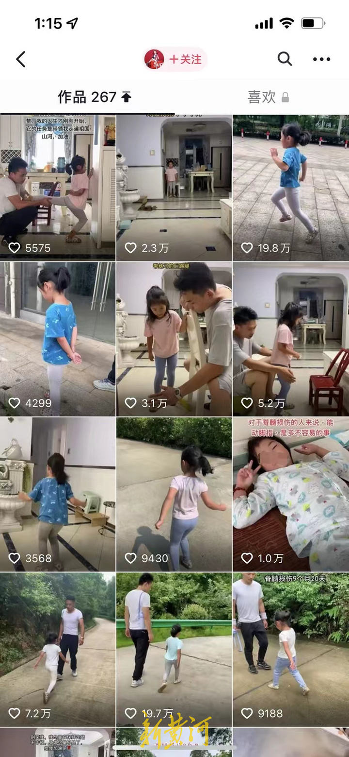 在艺曈康复训练期间,袁玲将艺曈训练的点滴拍摄下来,发布到了短视频平台。“起初我会偶尔分享艺曈复健的经历,后来忙得顾不上也想过断更。但有次我看到了留言,一位网友说,每当他坚持不下去的时候,就会来看看我的账号,艺曈给了他很大的动力。”袁玲那时才意识到,艺曈的经历已在无形中成了别人的精神支柱。