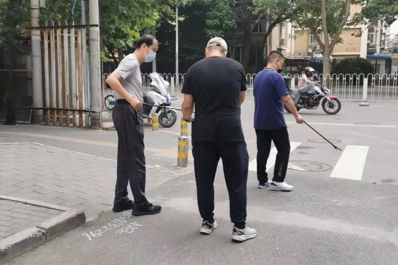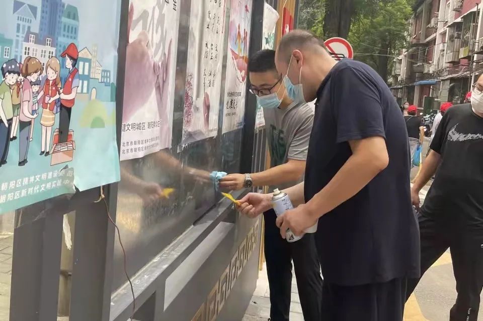 ▲大山子社区铲除墙面“小广告”、红霞路社区、中北路社区摆正路边乱停乱放的共享单车