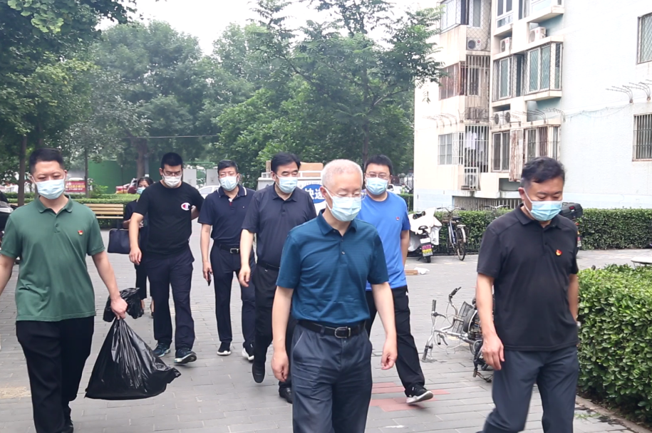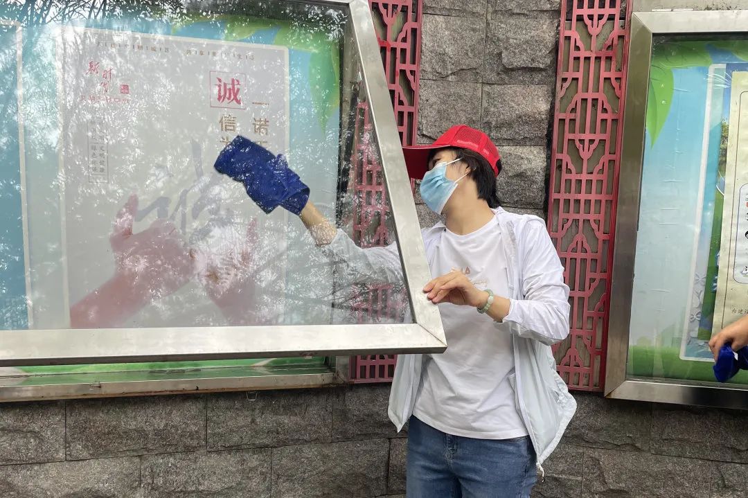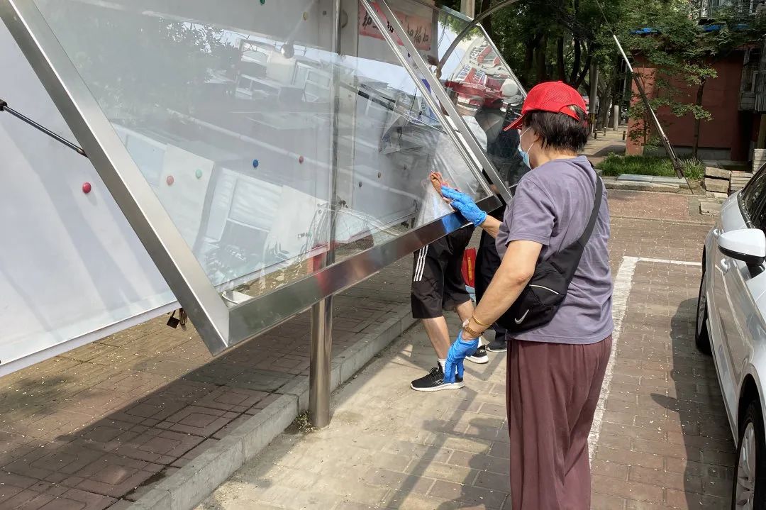 在驼房营西里社区,王旭主席拿起抹布、夹子等工具,与街道、社区干部及志愿者一起开展社区环境整治活动,将小区宣传栏处的灰尘、污渍以及路面垃圾一一清理干净,以实际行动倡导居民共同参与到文明创建中来。