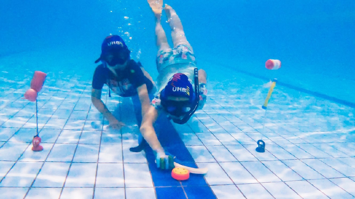 水下曲棍球是一项在游泳池底开展的团队对抗性运动,对抗双方单手持球棍,在泳池底争夺一个约1.3公斤重的水曲球,直至一方将球推入对方球门,即得一分。比赛通常在长约25米、宽12至15米、水深2至3.65米的泳池中进行。运动员会穿戴脚蹼、面镜、呼吸管等辅助装备,对抗双方以深浅两色球帽和黑白球棍作为区分。对抗时运动员会从四面八方冲过来,带来陆地二维运动没有的三维空间感,这也是水曲的独特魅力。