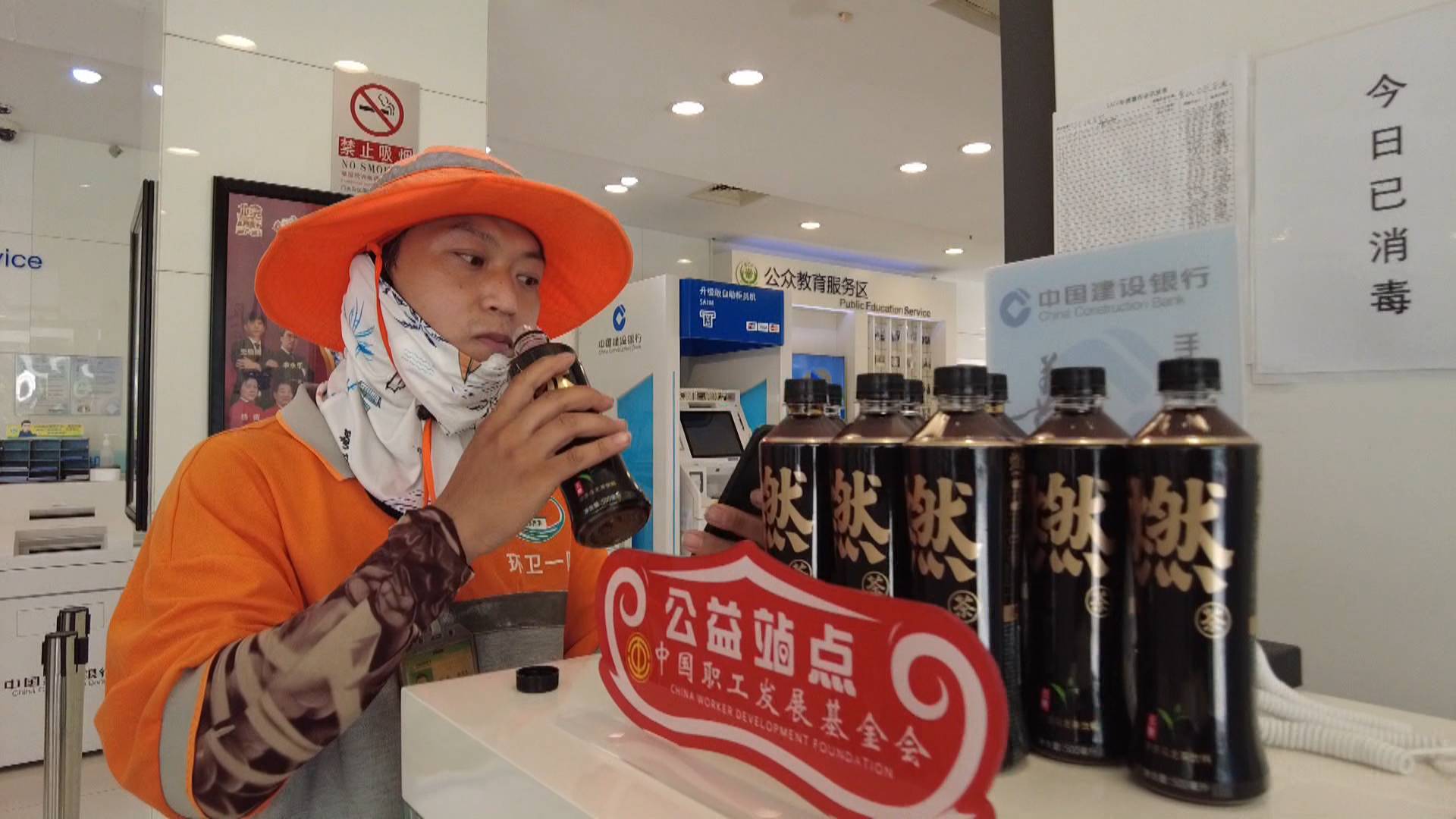 刚刚喝完水的环卫工人说:“不管什么时候来工作人员都很热情,提供这些水和饮料是免费的,冬天有热水,夏天有凉水,这几年不光我,同事也都来过,真是为我们户外工作者提供了一个休息的好地方。”