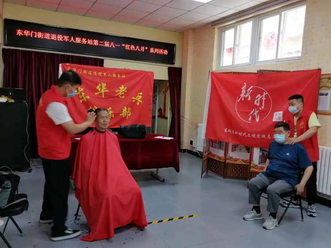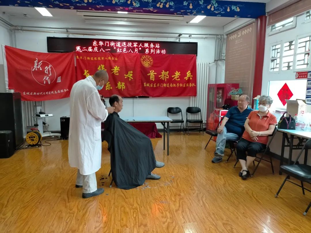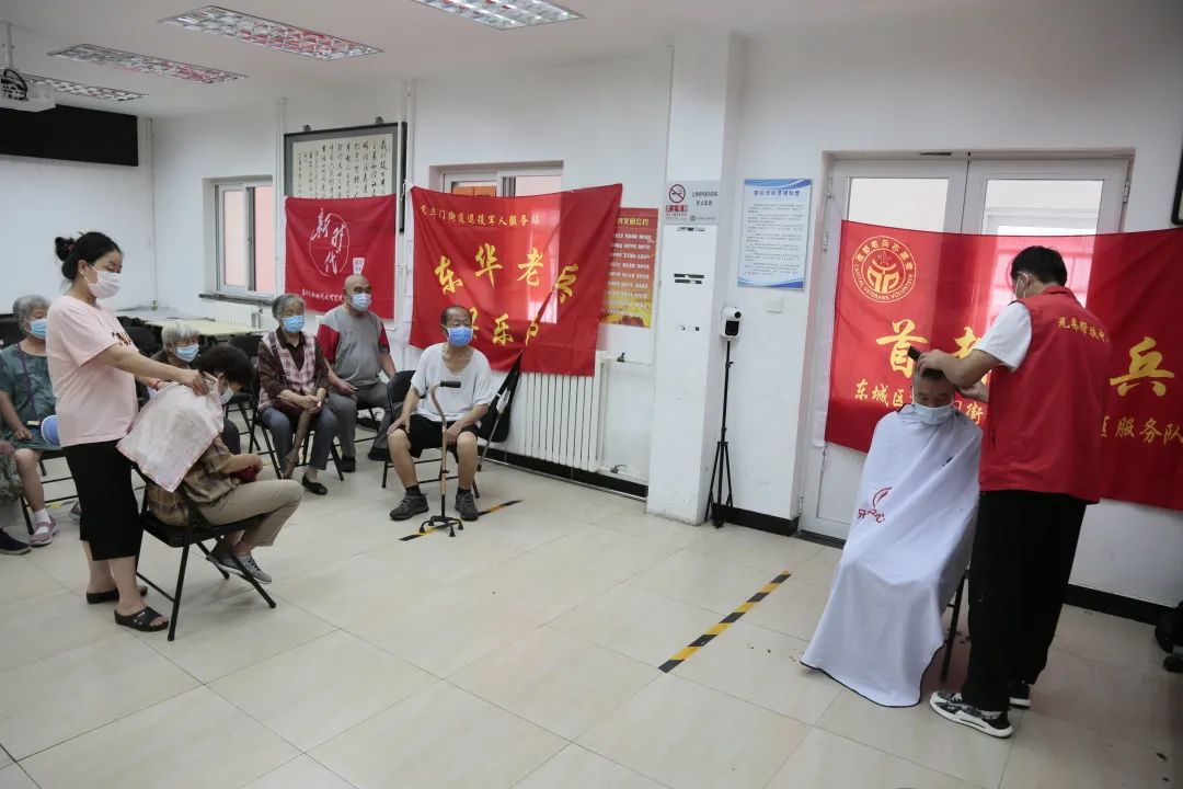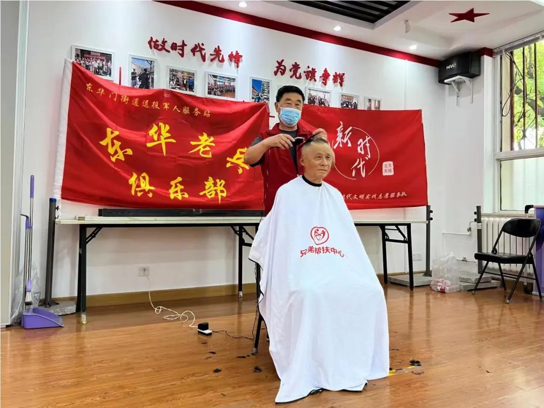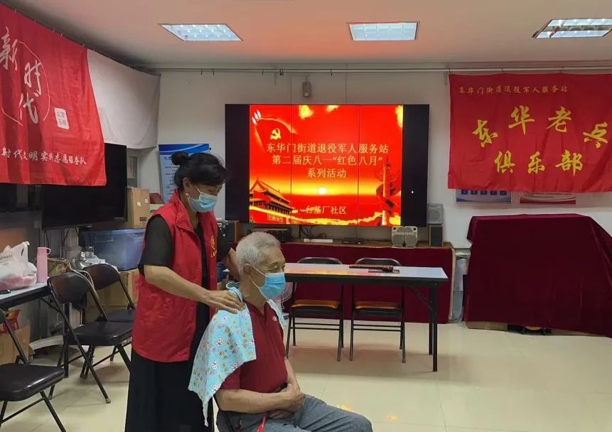 东华门街道10个社区同步开展活动,为辖区老兵们免费理发和按摩。兄弟帮扶中心的师傅们早早到场,用热情的态度专业的服务赢得了老兵们的一致好评。