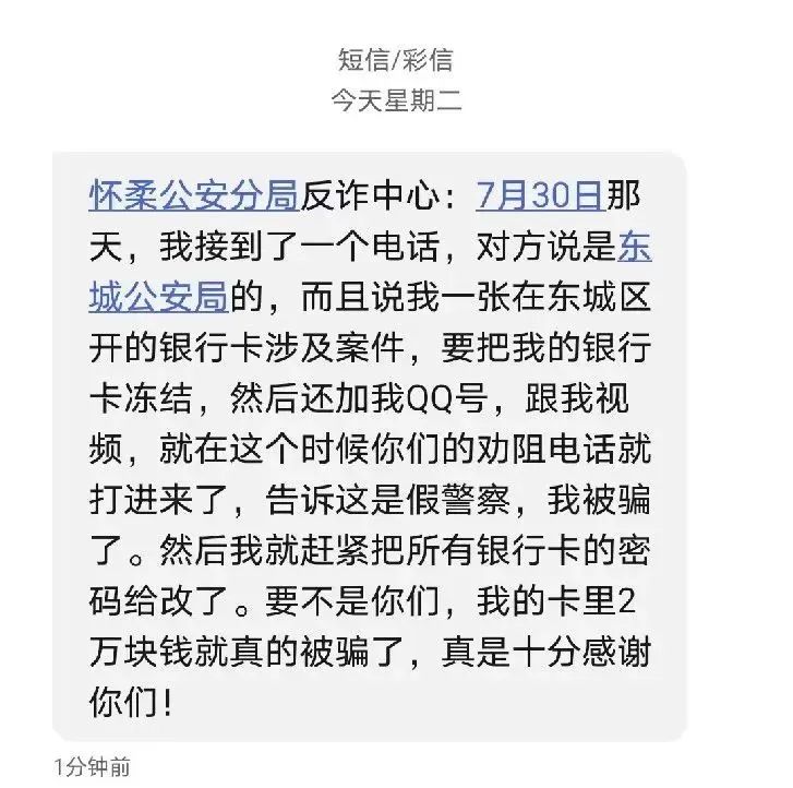 近日,怀柔公安分局成功阻止了1起电信诈骗案,及时为群众止损。