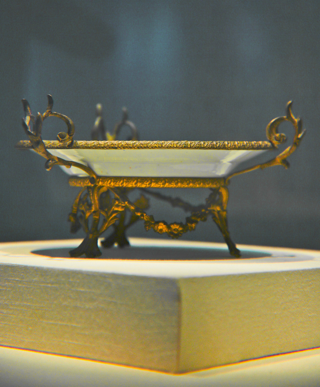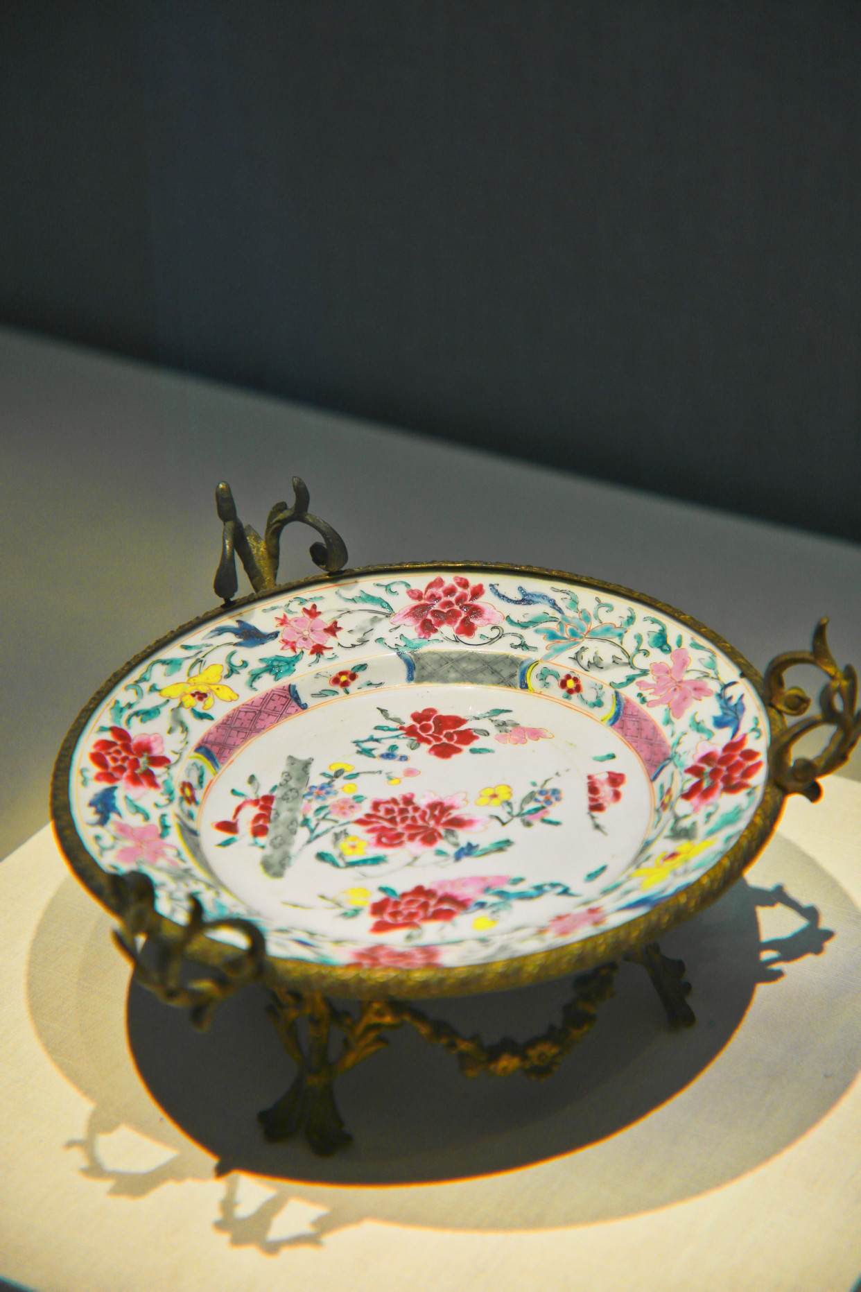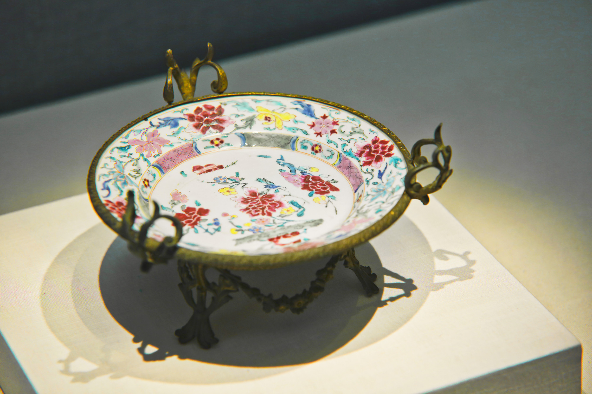 外销瓷在欧洲的使用经历中,常被加上金、银、铜等贵重金属,赋予了瓷器更多的功能和用途,形成一种全新而独特的艺术风格。此盘口、足均包铜,由三支铜制卷草耳连接,下承铜质三足托架,錾刻花草纹,改造后可作为果盘使用,成为一件中西文化交融的精美器物。