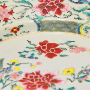 敞口,折沿,圈足。口沿饰多色牡丹花卉纹,内壁饰锦地开光花卉纹,盘心绘有数枝富丽娇艳的牡丹图案,花枝间有一绿色梅花纹饰的包袱卷轴,为画面增添了“花博古”的古典情趣,有博古通今、崇尚儒雅之寓意。