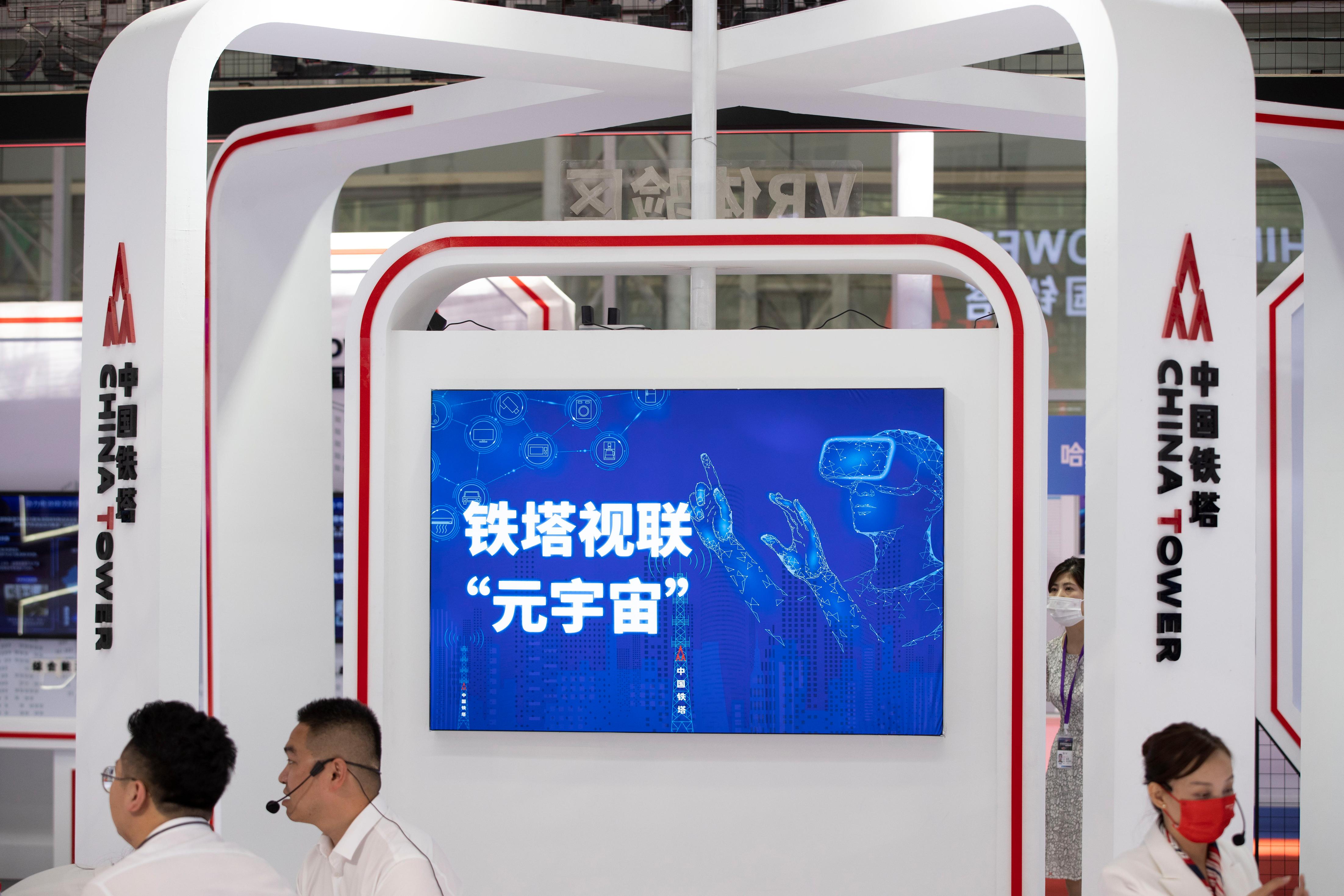 9日,在中国铁塔股份有限公司展区,工作人员在布展。