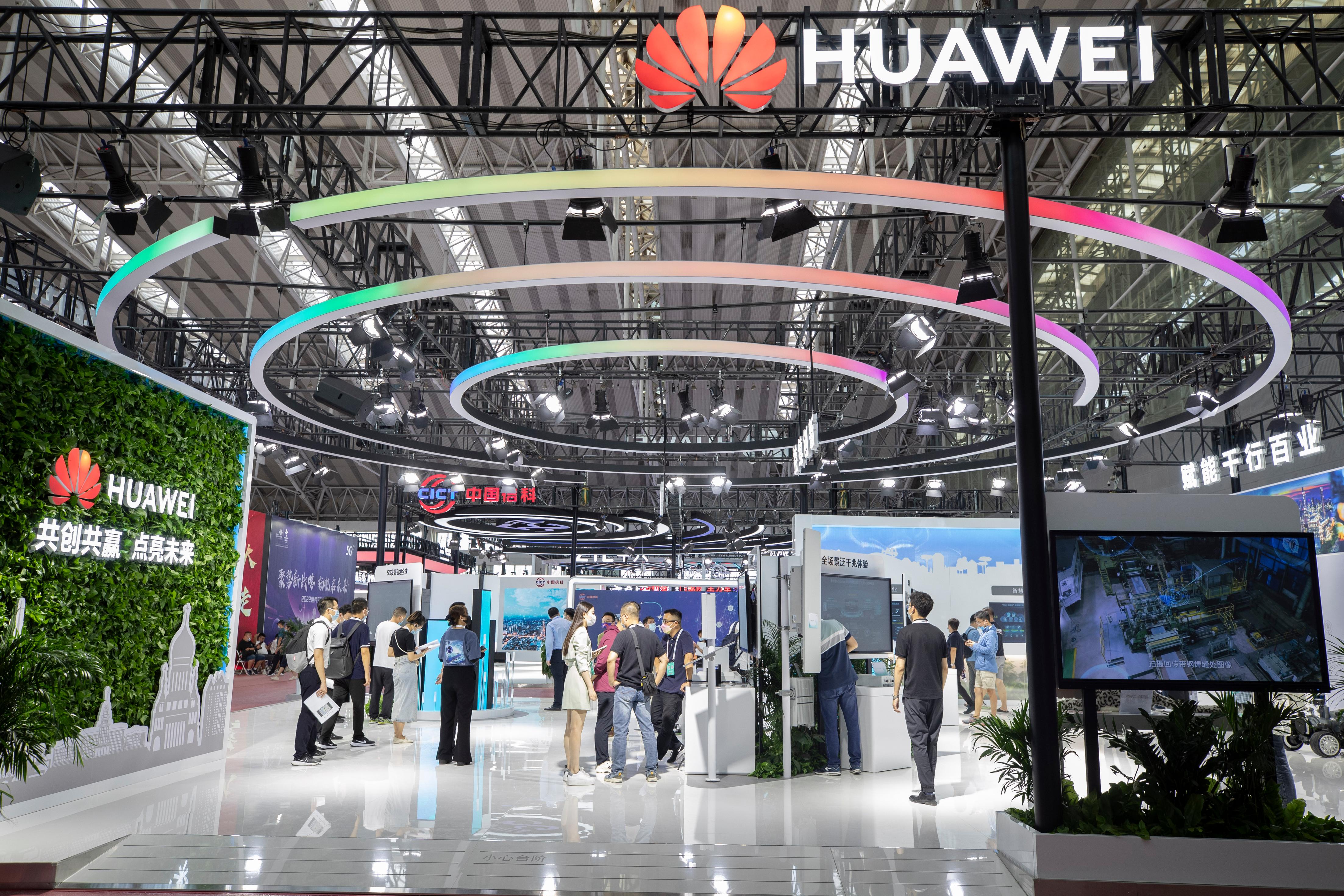 9日,在中国电信集团有限公司展区,工作人员在备展。