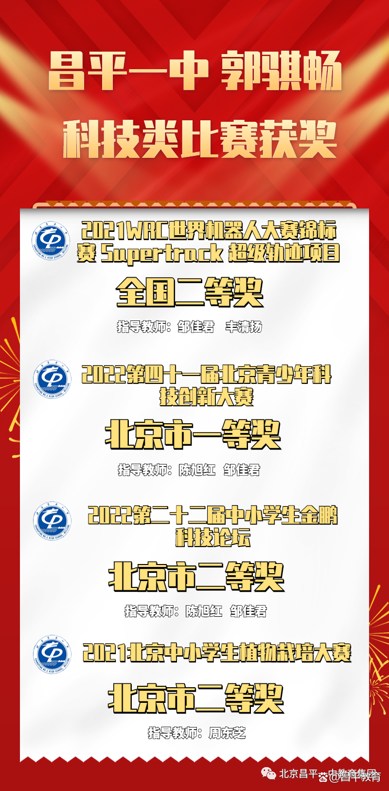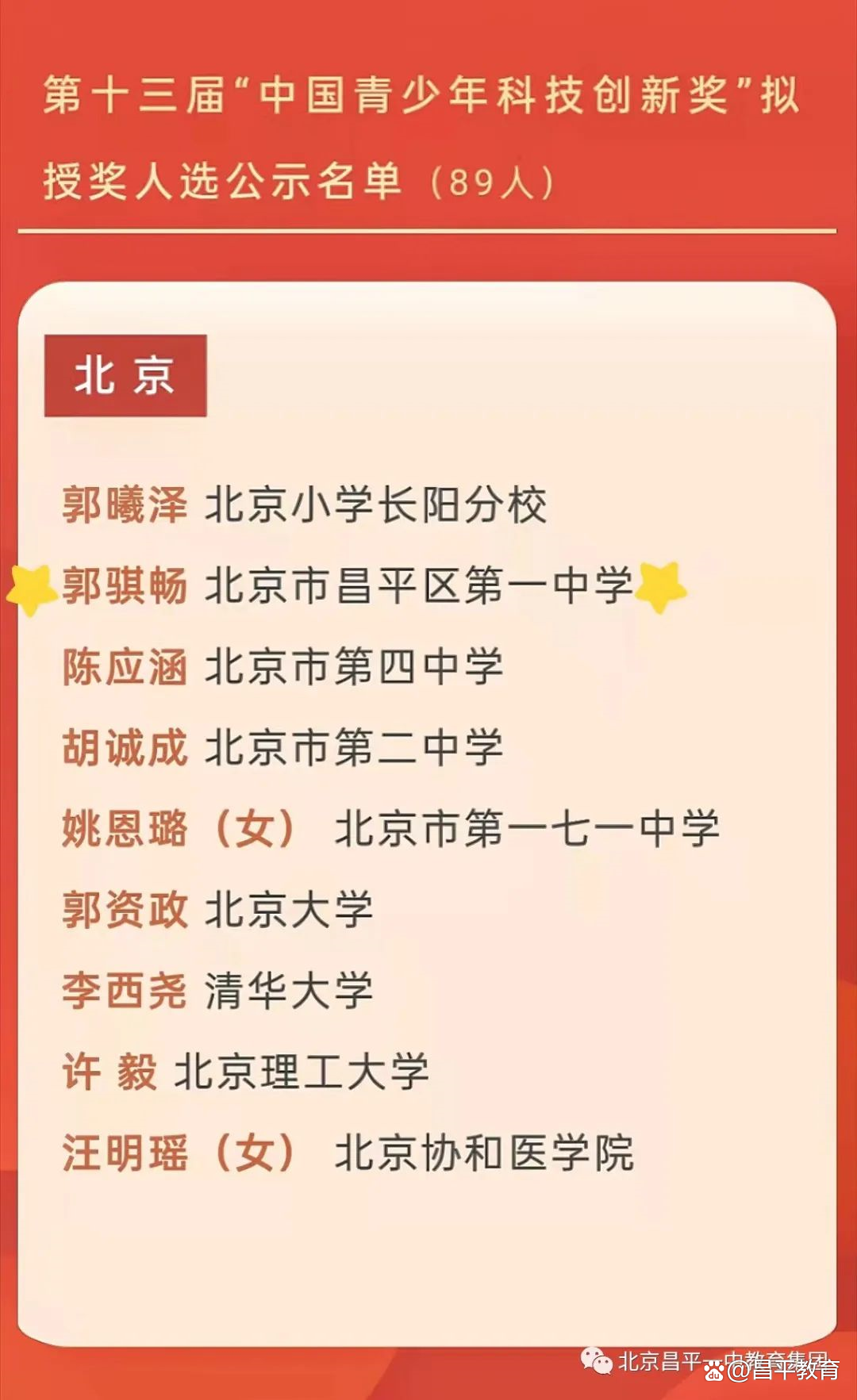 近日,第十三届“中国青少年科技创新奖”获奖名单公布,本届中国青少年科技创新奖在各地区和有关单位严格选拔、认真推荐的基础上,经过评审委员会审核评定,全国共有89名学生获奖,其中北京市仅有9名学生,昌平一中郭骐畅同学位列其中!