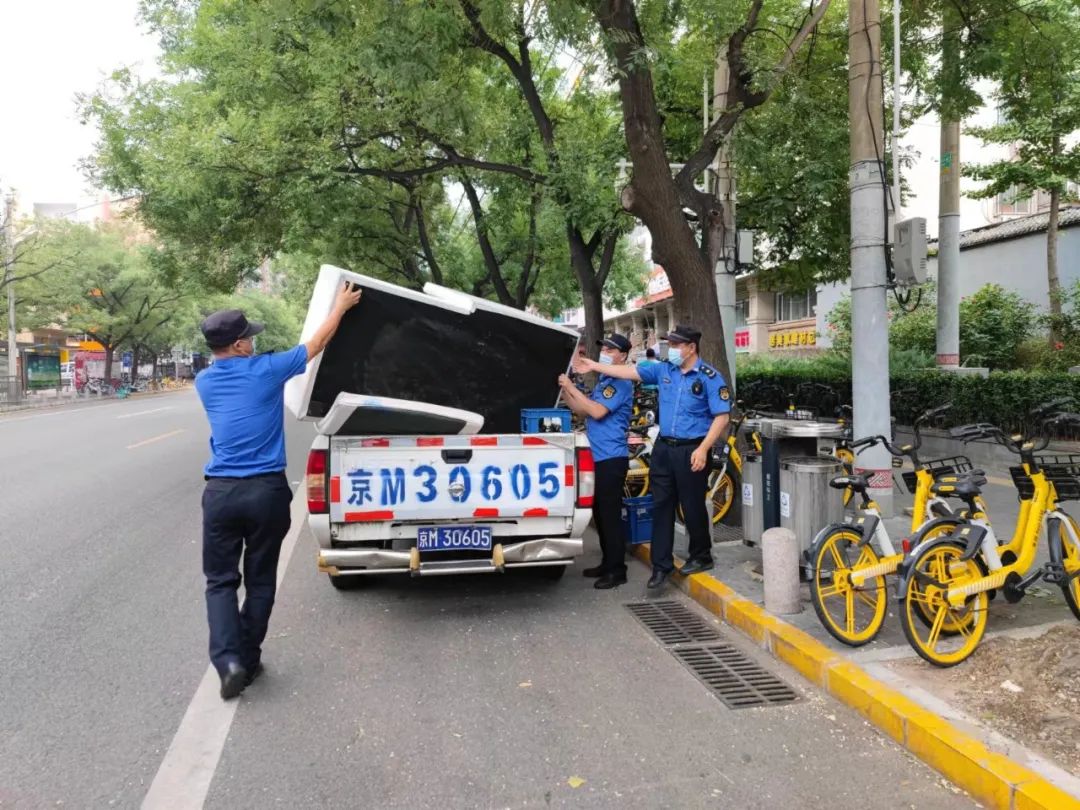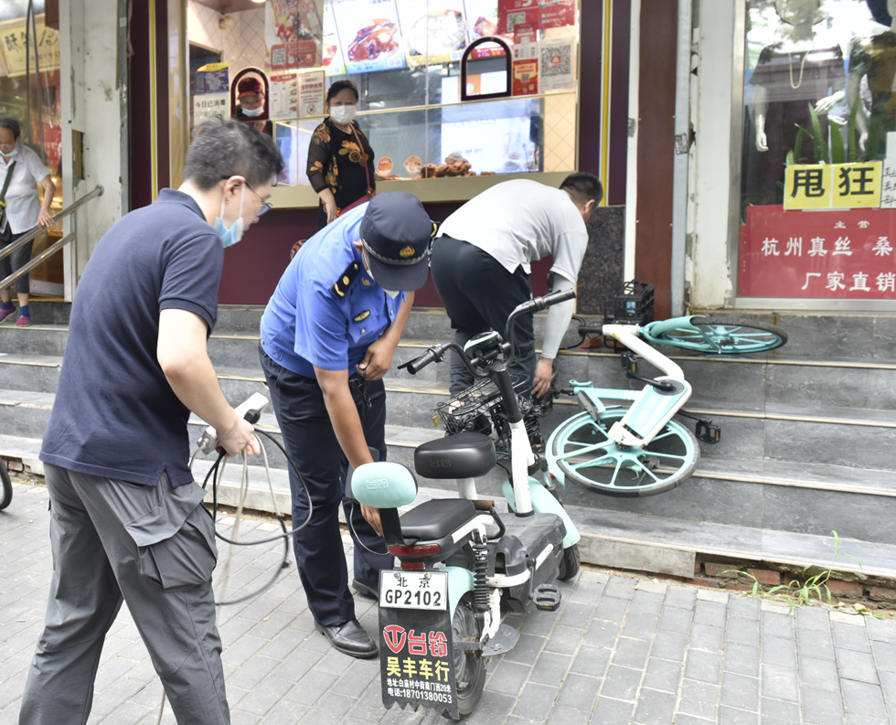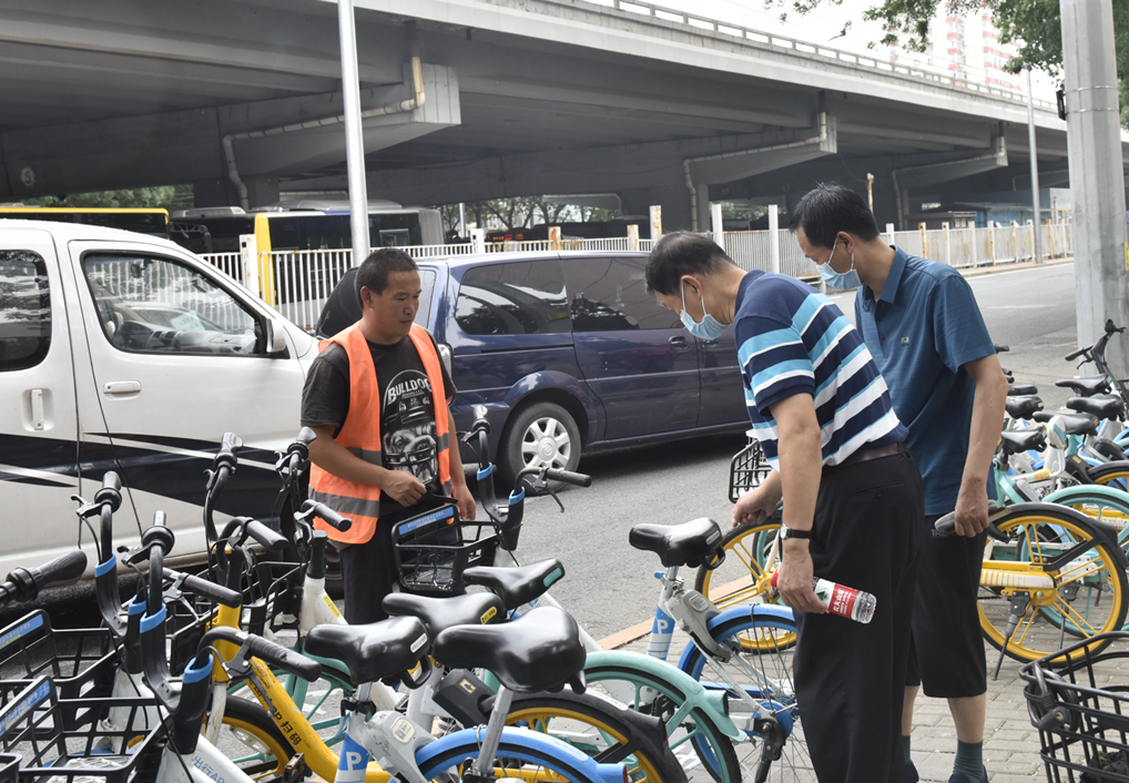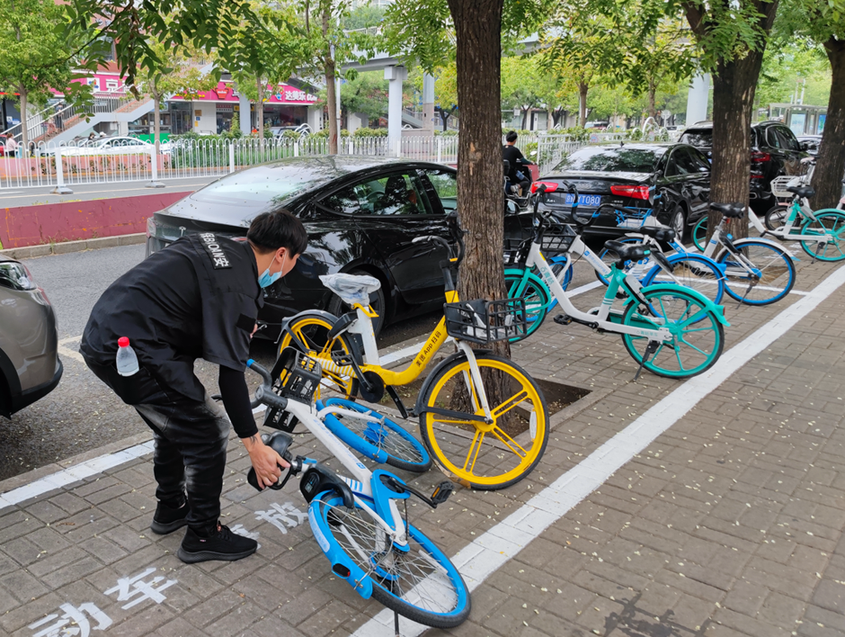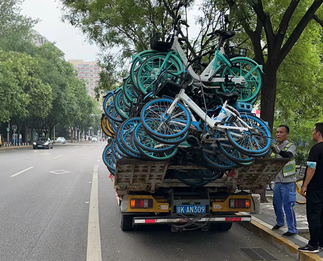 街道平安建设办公室清理整治乱停乱放的共享单车,有效解决共享单车无序投放、投放过度、严重挤占公共空间等问题,打造整洁、有序的市容环境。