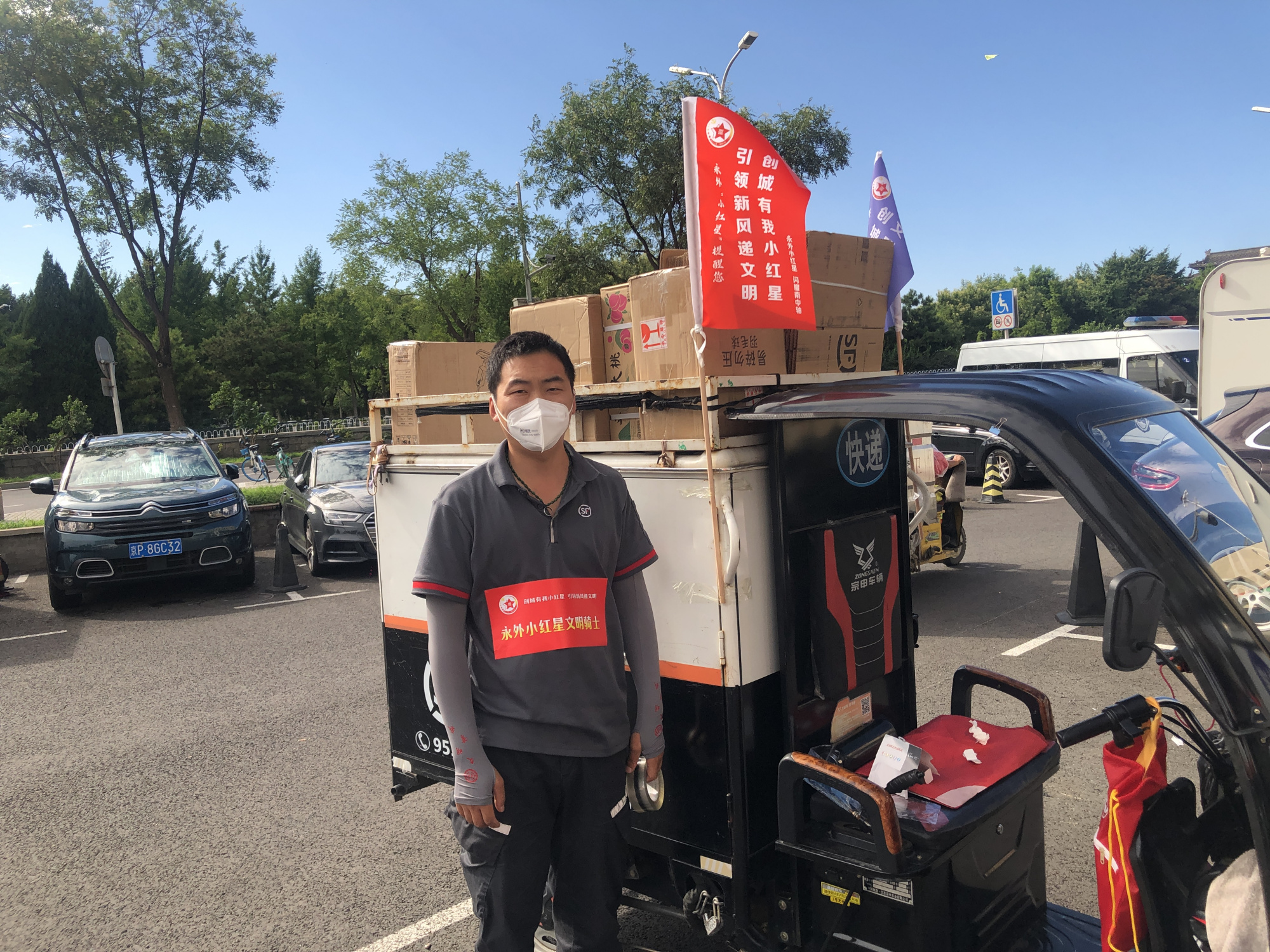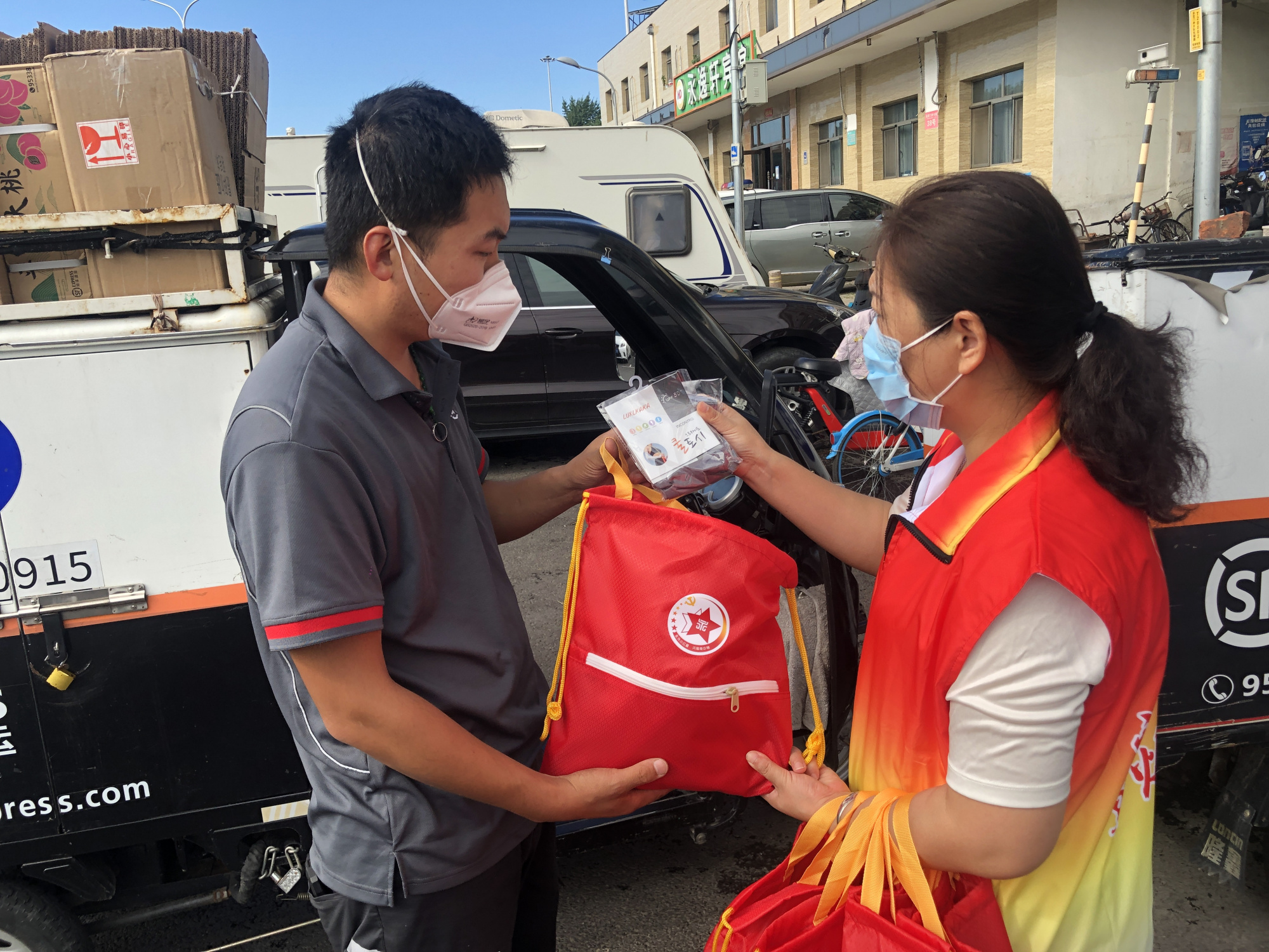 “师傅,您辛苦啦!这个‘红色邮包’里有文明宣传防晒冰袖、N95口罩、手消等必备物资。”