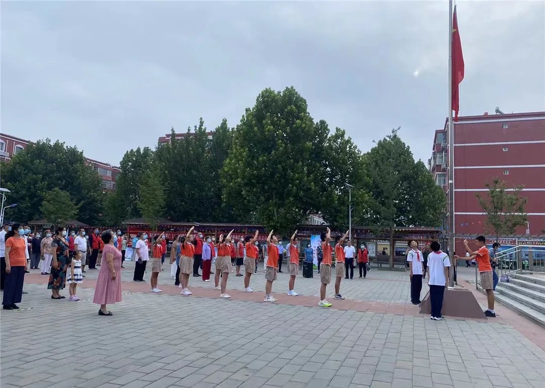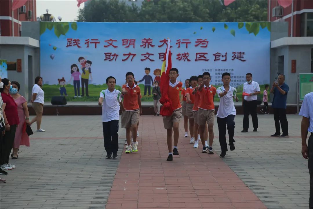 在社区全体人员的注目下,红旗护卫队队员护送鲜艳的五星红旗进场,伴随着庄严的国歌,五星红旗冉冉升起,迎风飘扬。随后,由东菜园社区青少年代表宣读了创城倡议,倡议更多的人加入到全国文明城区创建的行列中。