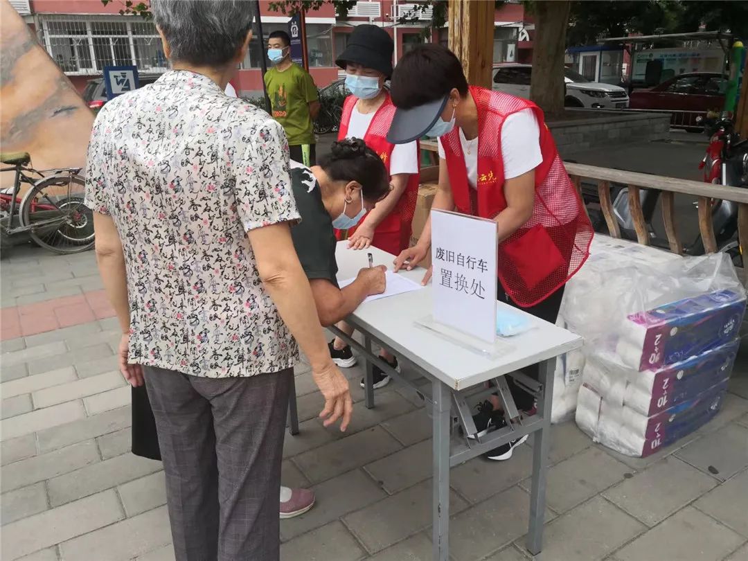废旧自行车堵塞消防通道、影响环境美观,如何处置?用旧物置换生活小物品,既给这些旧物安排了新去处,又提高了它的利用价值。废旧物品置换生活用品受到居民的青睐,居民可用家中废弃自行车、楼道杂物、废旧家具等物品在置换点兑换生活用品。引导居民自觉清理废旧物品,树立共同保护社区环境生活理念。