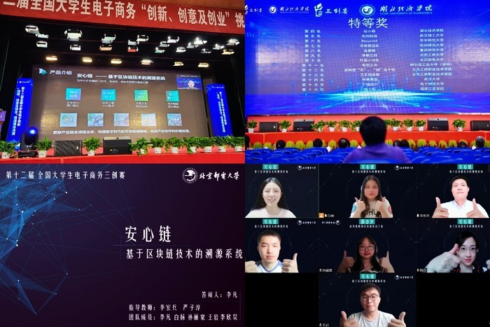 来自全国高校13万多支队伍参赛。北京赛区有7支团队晋级国赛,北邮荣获1个全国特等奖、2个全国一等奖,其中由李宏兵、严子淳老师指导的“叶脉小分队”团队的《安心链——基于区块链技术的溯源系统》荣获第十二届全国大学生电子商务“创新、创意及创业”挑战赛全国特等奖、全国最佳创意奖、全国最佳指导老师奖。
