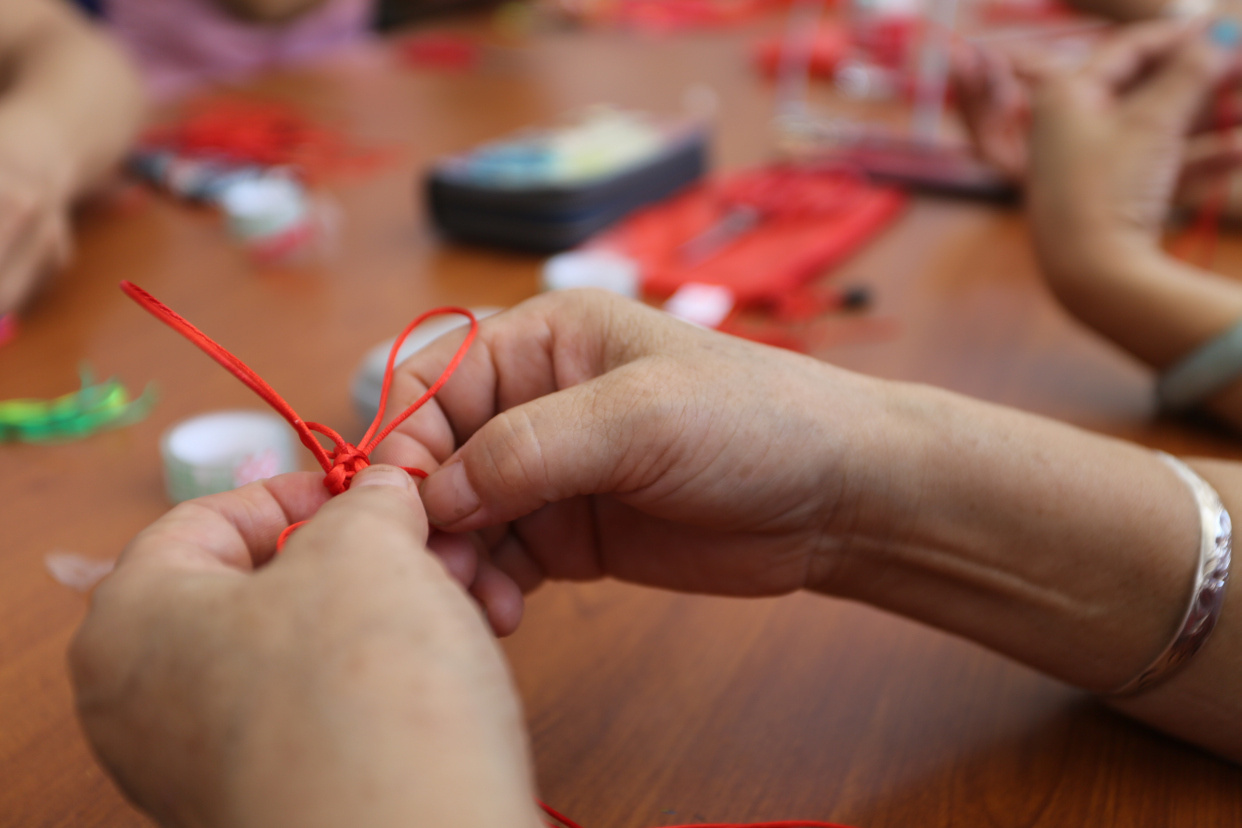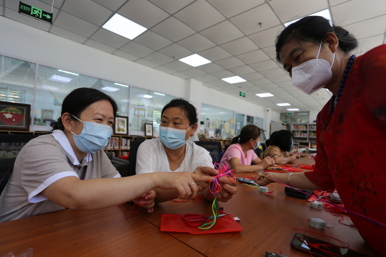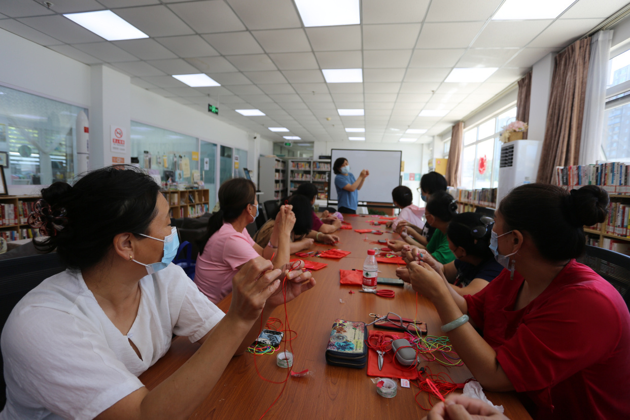 此次活动由北京市丰台区职业教育中心学校的王合香老师为大家讲解中国结的由来和含义,手把手教居民编织中国结。中国结象征着喜庆,在中国红的映衬下,将团结一心、吉祥如意等的美好寓意相互传递。中国结从头到尾是用一根丝线编结而成,把不同的结饰互相结合在一起,有的与吉祥图案搭配组合,形成了造型独特、绚丽多彩、寓意深远、内涵丰富的中国传统吉祥装饰物品。虽然编织过程很困难,稍不留神就容易出“岔子”,但大家兴致勃勃,反复尝试学习,结对互帮,最终,一个个中国结呈现在大家面前。