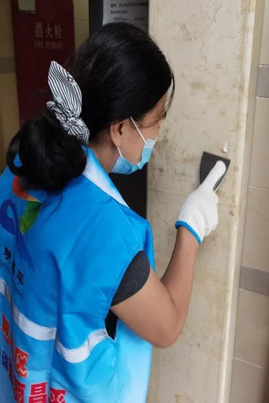 面对形形色色的小广告,大家用铲子逐一进行清理,遇到粘得特别牢固的小广告,就先喷些水,用手一点一点将其撕离墙体,再用铲子进行清除。在清理过程中,志愿者们还不忘向过往居民进行环境卫生宣传,监督乱贴广告的行为,每个人都做到主动制止。
