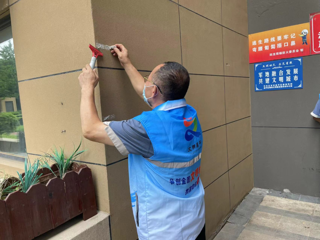 蓝天嘉园社区组织志愿者们对小区内的公共区域内存在的违法小广告开展了清除行动。重点查看小区的信报箱、垃圾清运站、水站和单元门禁附近,只要发现小广告立即进行清除。