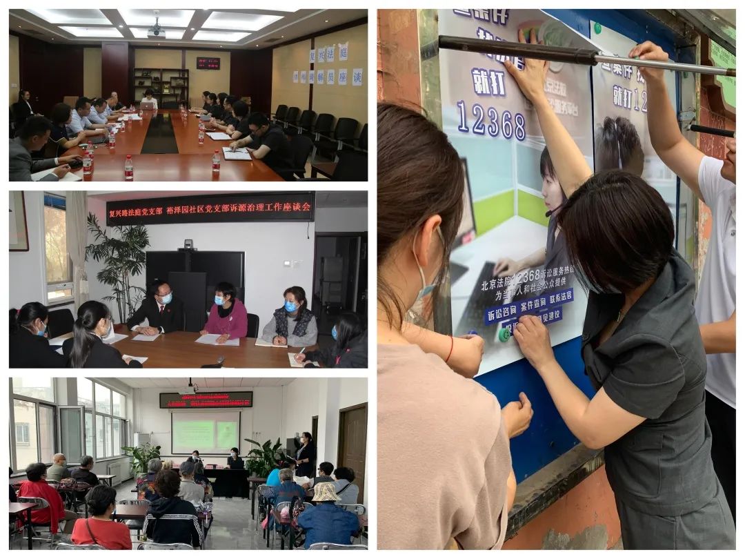 比如,积极参与溯源治理,前往红莲村张贴海报,宣传12368诉讼服务热线;庭党支部与裕泽园社区党组织座谈会,积极交流工作经验;组织律师调解员座谈会,提高案件调解率等。
