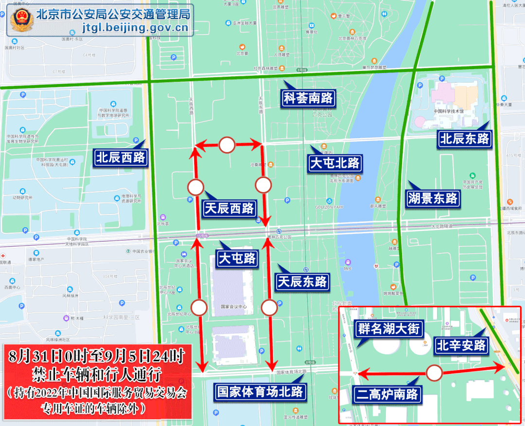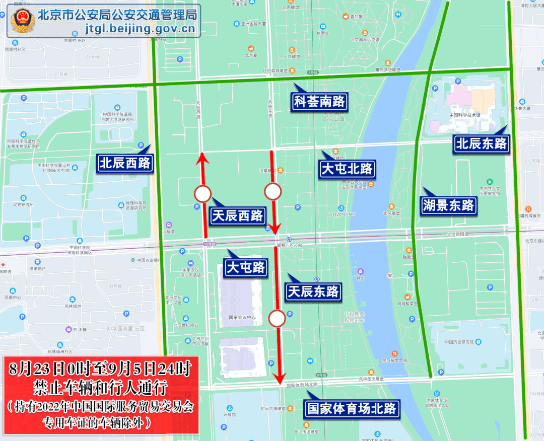 (一)8月23日0时至9月5日24时,朝阳区天辰东路由大屯路与天辰东路交叉口(不含)至国家体育场北路与天辰东路交叉口(不含)北向南方向,由大屯北路与天辰东路交叉口(不含)至大屯路与天辰东路交叉口(不含)北向南方向;天辰西路由大屯路与天辰西路交叉口(不含)至大屯北路与天辰西路交叉口(不含)南向北方向,禁止车辆和行人通行。途经车辆和行人可经北辰东路、北辰西路、湖景东路、科荟南路、北四环路绕行。