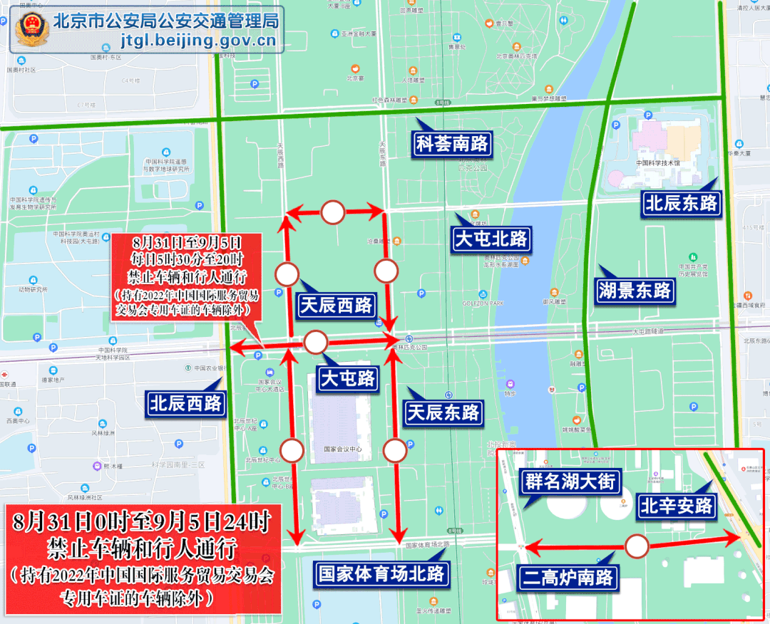 (二)8月31日0时至9月5日24时,朝阳区天辰东路由国家体育场北路与天辰东路交叉口(不含)至大屯路与天辰东路交叉口(不含)南向北方向;天辰西路由国家体育场北路与天辰西路交叉口(不含)至大屯路与天辰西路交叉口(不含)南北双方向;大屯北路由天辰西路与大屯北路交叉口(不含)至天辰东路与大屯北路交叉口(不含)东西双方向;石景山区二高炉南路由北辛安路与二高炉南路交叉口(不含)至群名湖大街与二高炉南路交叉口(不含)东西双方向,禁止车辆和行人通行。途经车辆和行人可经北辰东路、北辰西路、湖景东路、科荟南路、北四环路、北辛安路、石景山路绕行。
