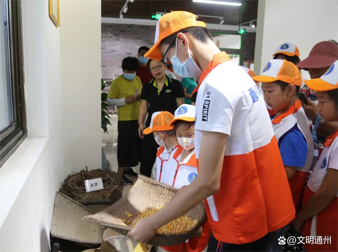 “大家看,这个叫‘升’,是古代的粮食计量用具,在里边装满粮食后,多出来的拔尖部分用尺子刮掉就是一升。”“这是粮票,是20世纪50年代至80年代,中国在特定经济时期发放的一种购粮凭证,当时没有它就买不了粮食。”“这是簸箕,双手来回簸,可以把粮食里的草、石子簸出来。”