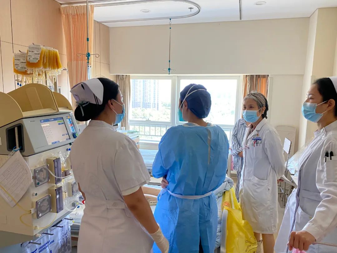 麻醉科副主任孙可在患者意识障碍配合不利的情况下,协助风湿免疫科医生完成腰穿鞘内注射治疗。肾内科副主任张东亮带领血液净化团队给予极大配合,首次在新龙泽院区普通病房完成危重症患者床旁血浆置换。输血科主任葛艳玲也给予了大力支持,联系血站配足上万毫升的血浆,支持临床抢救治疗使用。李云龙护士长带领病区护理团队加班加点,昼夜精心守护患者,保质保量地完成了血浆置换治疗。王艺护士长特意赶到新龙泽院区协助指导患者复杂伤口换药。