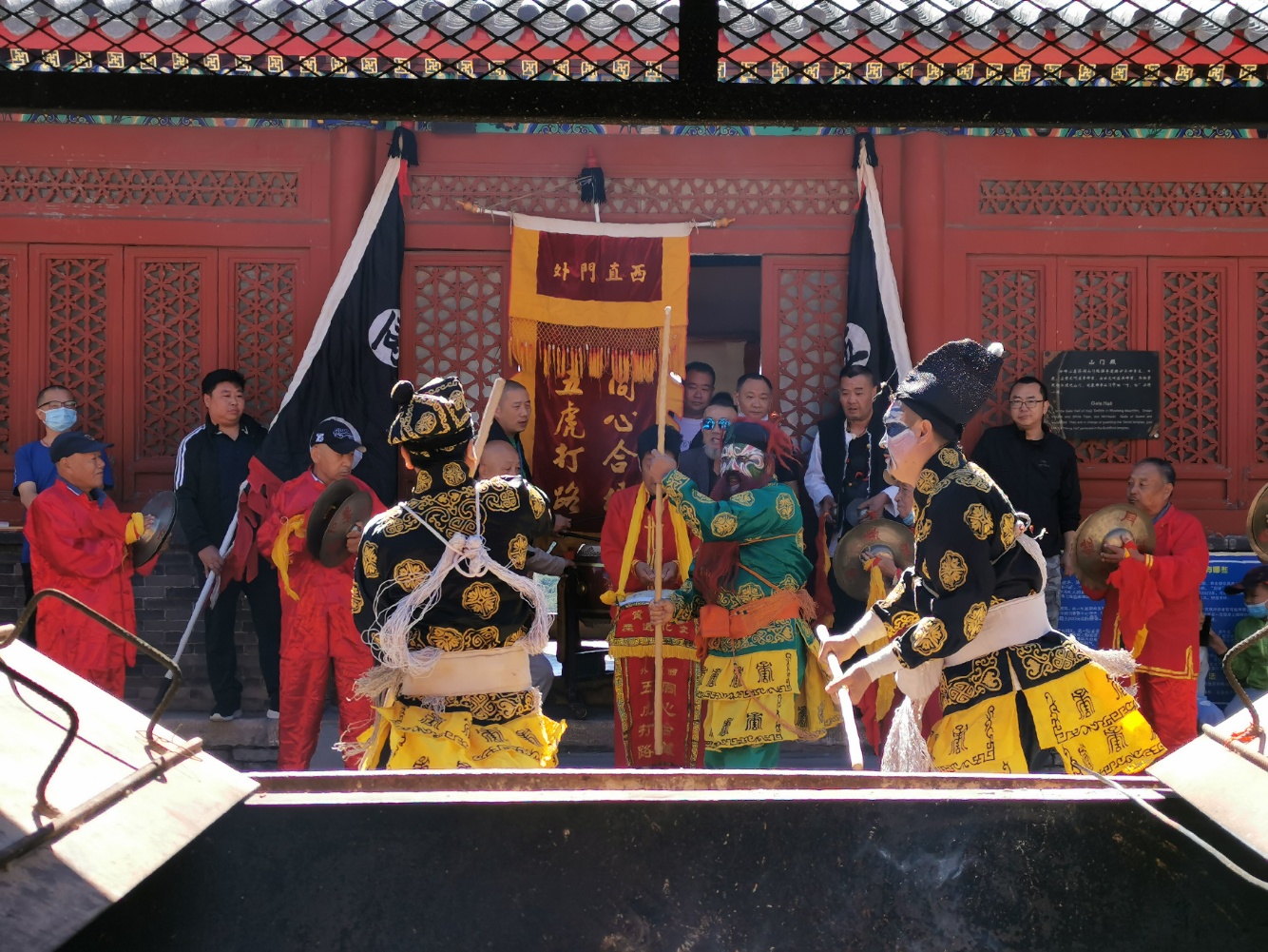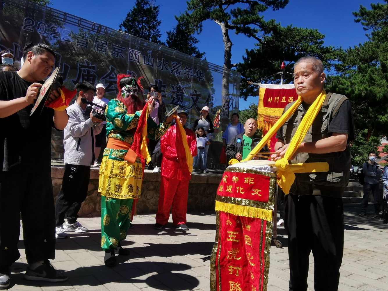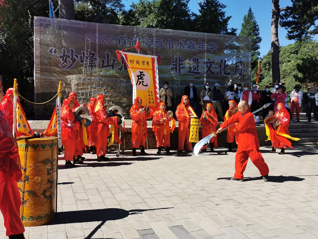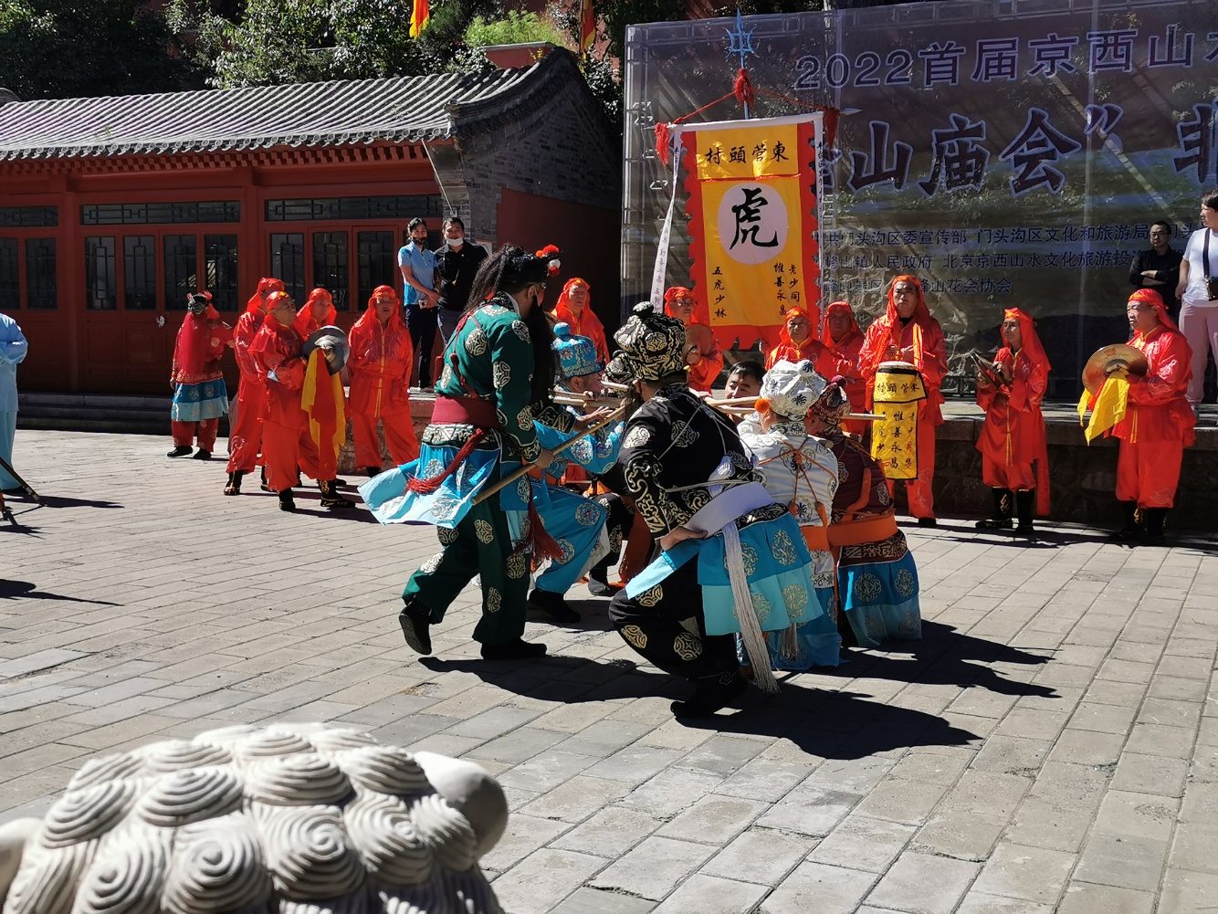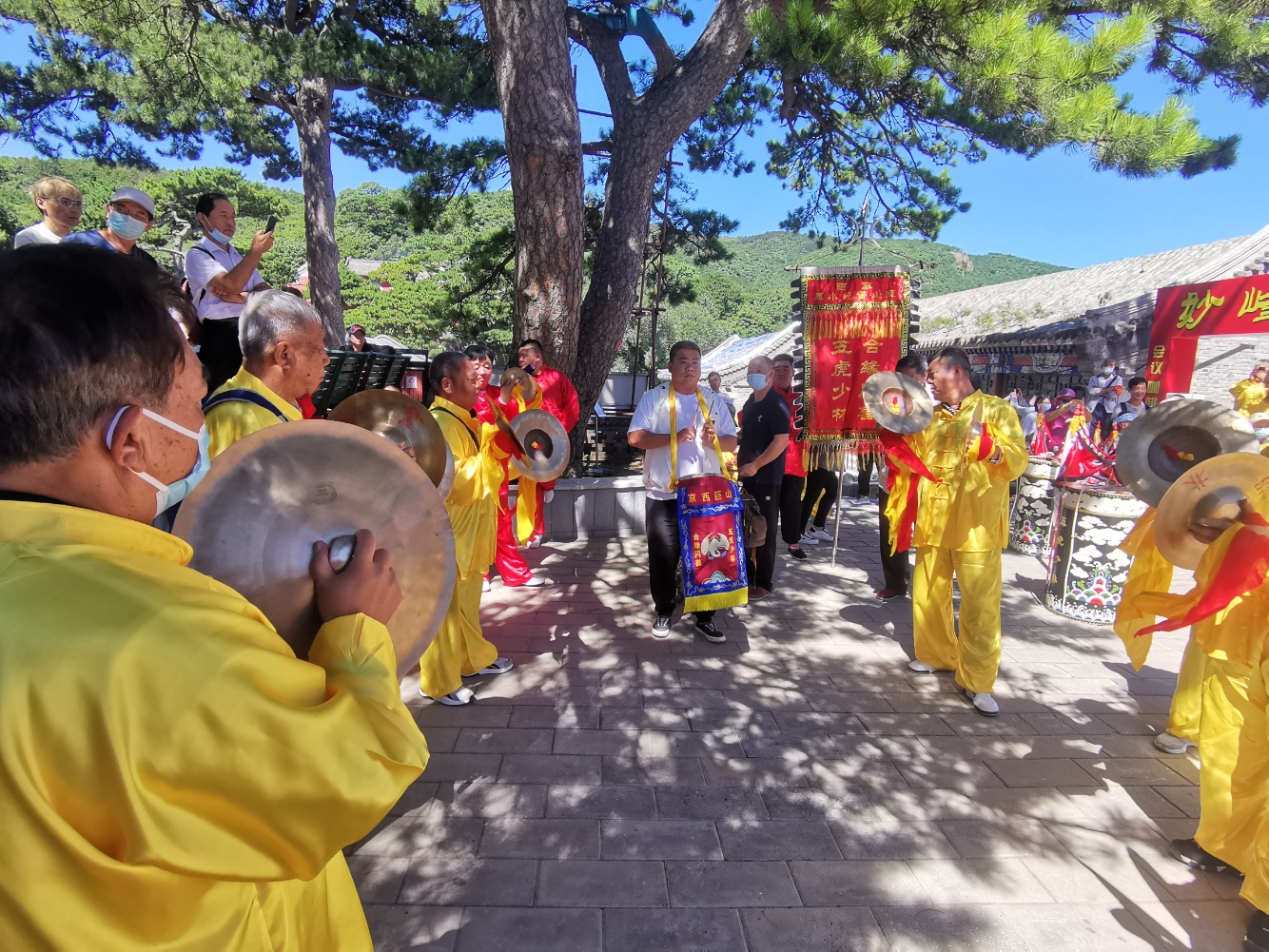 活动当天,妙峰山景区锣鼓喧天,人流如织。朝阳区非遗项目西直门外同心合缘五虎打路、丰台区非遗项目老少同乐五虎少林、海淀区非遗项目京西蓝靛厂同心合善蝴蝶少林、京西巨山合缘同善五虎少林的4档花会组织前来进香献艺。