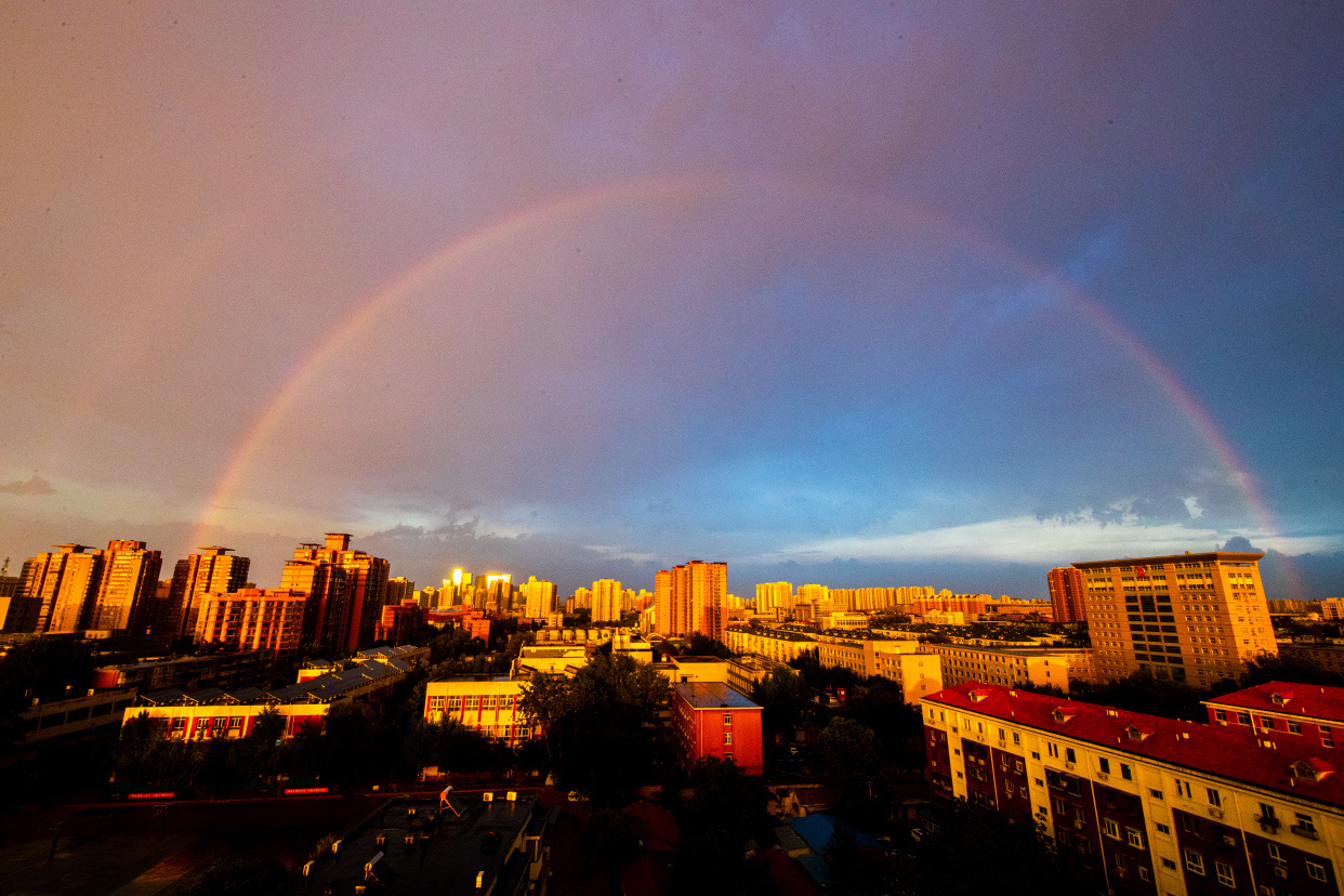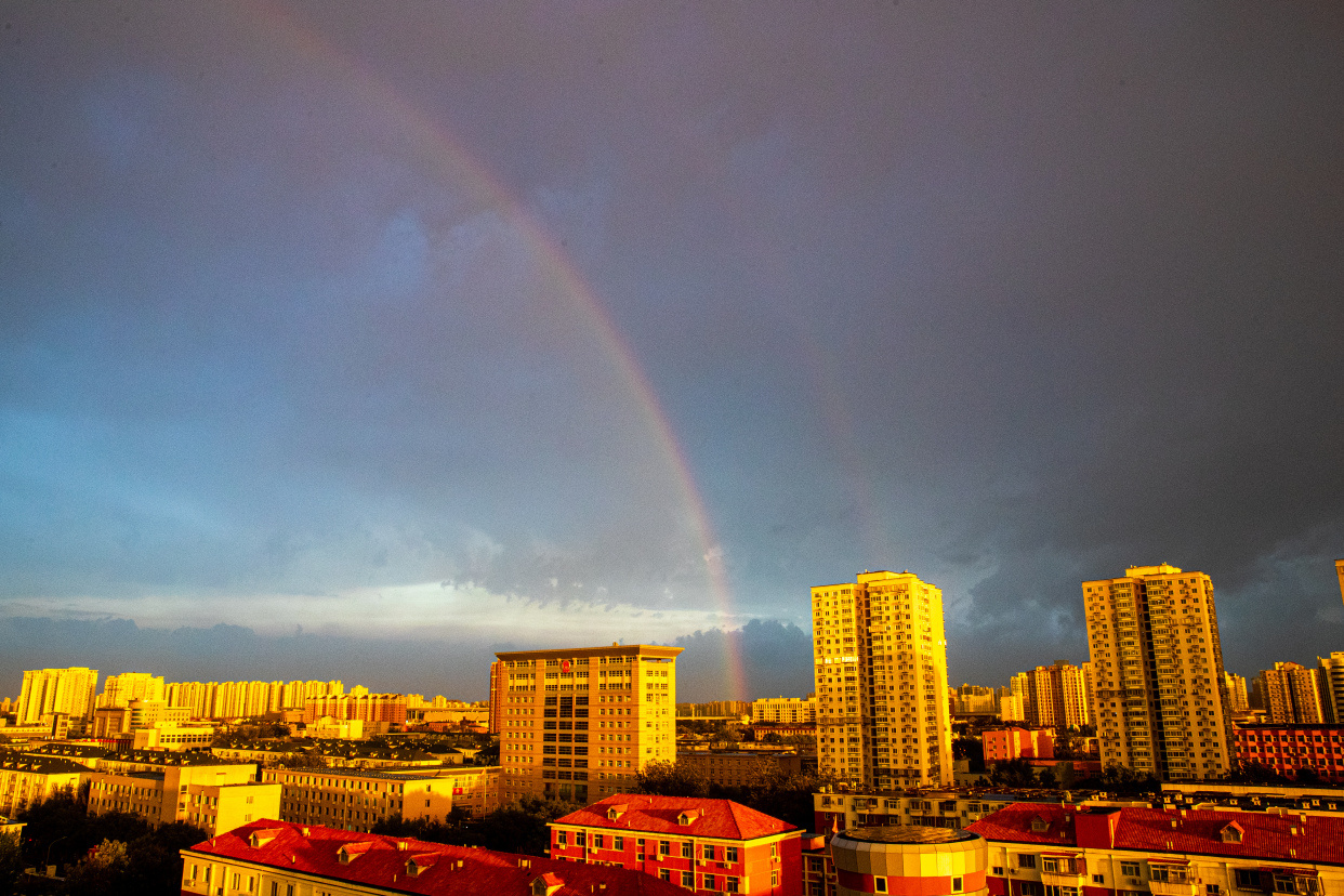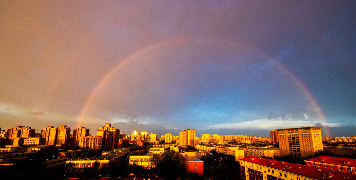 今日傍晚,北京大部分地区经历雷阵雨天气,局地短时雨强较大。雨后,在夕阳的映衬下,双层彩虹高挂在丰台区上空,把城市装点得格外美丽,丽泽金融商务区也被照耀的金碧辉煌。