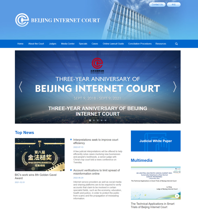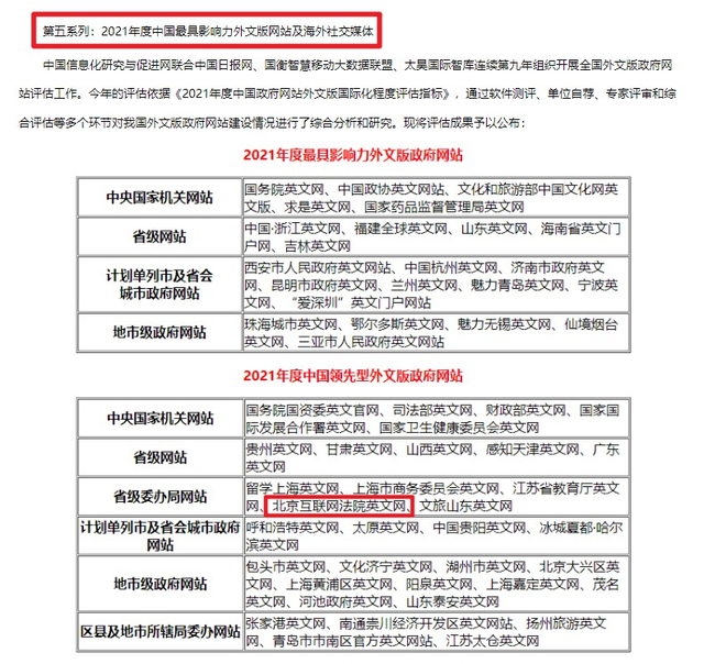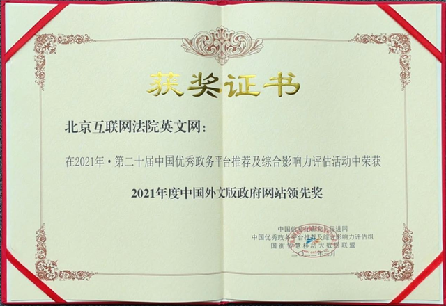 近日,北京互联网法院英文网站在2021年第二十届中国优秀政务平台推荐及综合影响力评估活动中荣获“中国外文版政府网站领先奖”。这是自北京互联网法院英文网站上线以来,连续三年在评估活动中获奖。