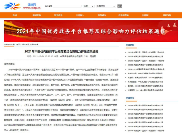 中国优秀政务平台推荐及综合影响力评估活动由中国信息化研究与促进网联合国衡智慧移动大数据联盟、中国日报网等权威机构联合开展。本次评估以“数字政府建设驱动中国数字化转型”为主题,通过软件测评、在线申报、问卷调查、单位自荐、专家推荐、综合评估等六大类方法对我国外文版政府网站建设情况进行评估。本次共有34个网站荣获该奖。