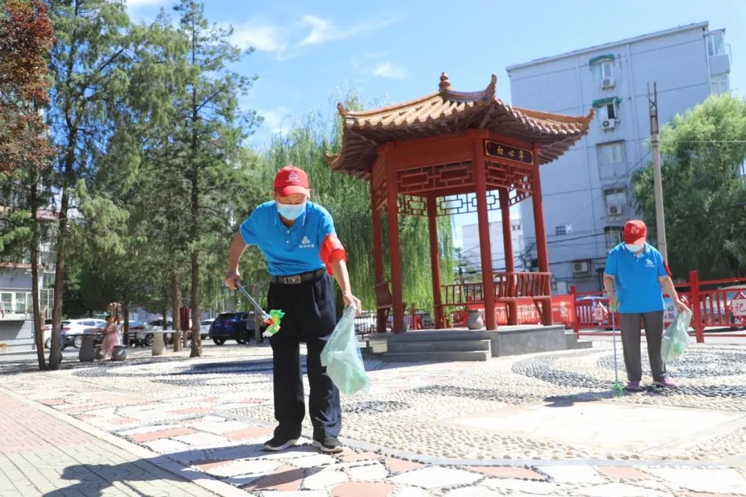 义宾北社区志愿者在社区初心亭捡拾杂物。
