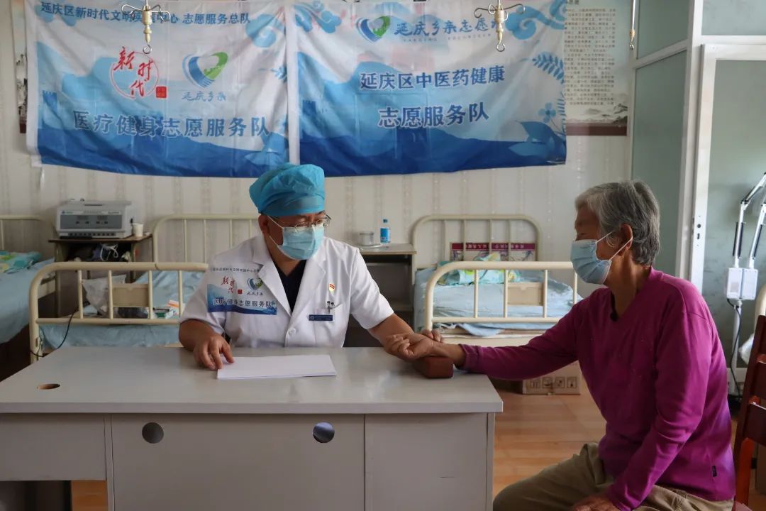 在张山营镇姚家营村卫生室,延庆区卫生健康志愿服务队张山营镇分队的医生正在给村民号脉。张山营镇分队每月都会深入基层,为村民义诊,并在义诊过程中宣传健康知识,提升村民的健康生活意识和健康水平。