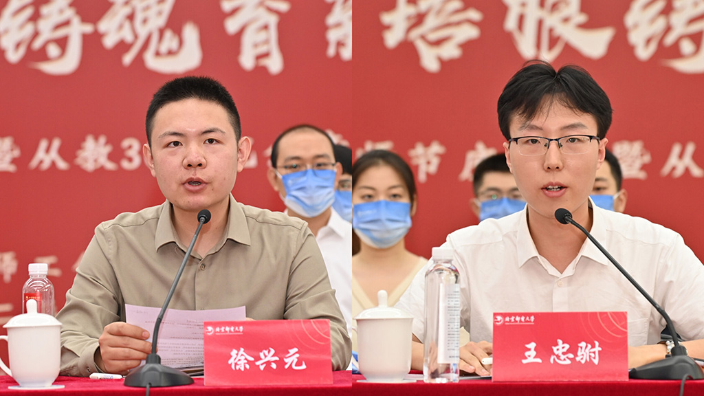 座谈会上从教30年教师代表戴志涛、援建教师代表徐静、新教师代表徐兴元结合自身经历抒发了对“培根、铸魂、育人”的理解,学生代表王忠驸表达了在北邮求学的感受,抒发了对老师们真挚的感激与节日的祝福。