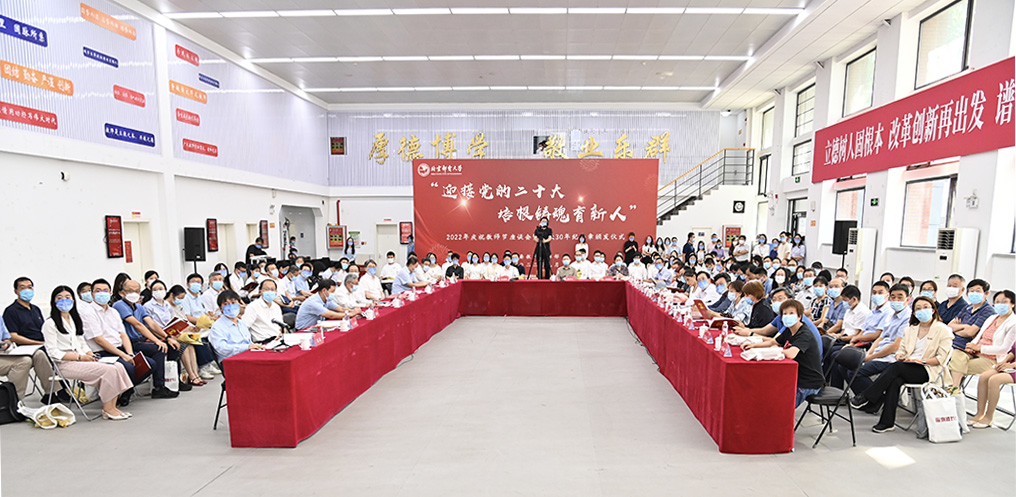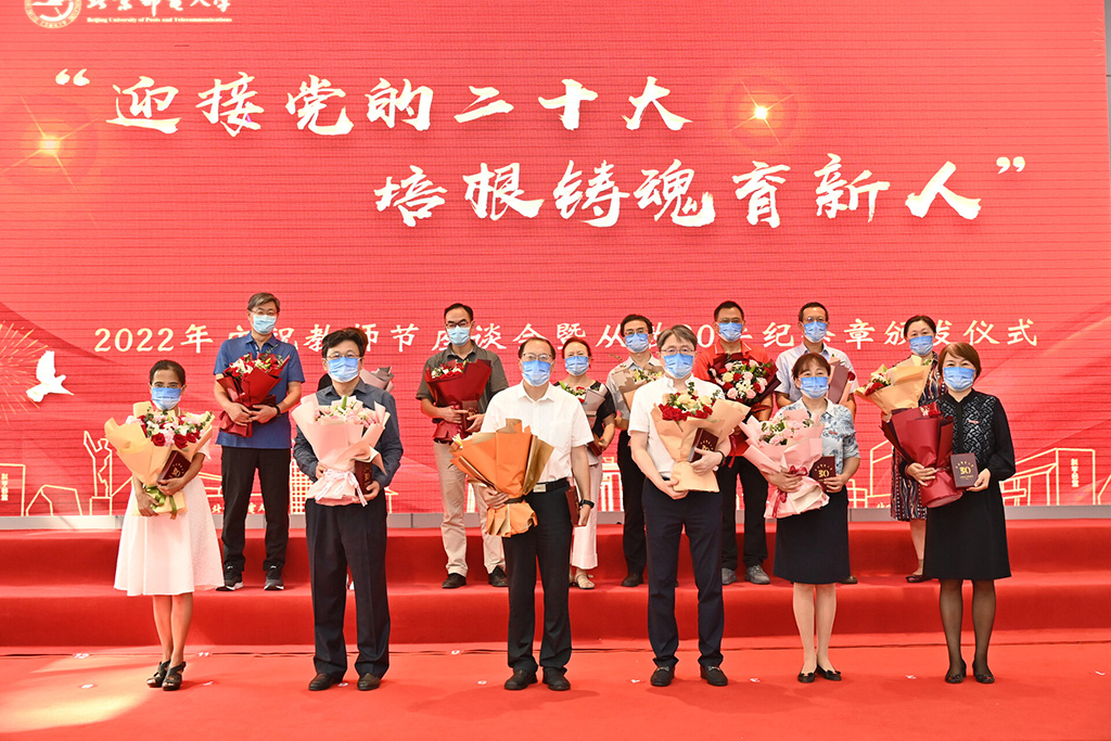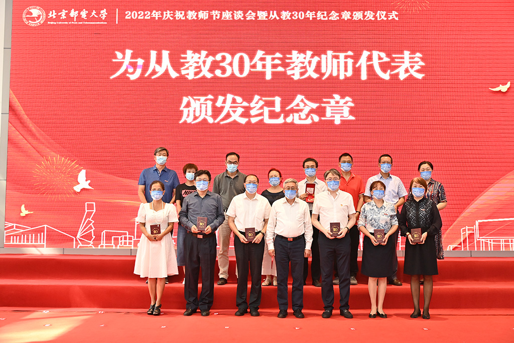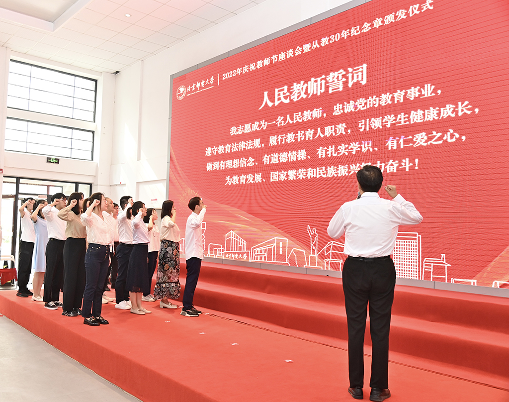 今年9月10日是我国第38个教师节,也是党的十八大以来第10个教师节。为庆祝教师节,充分展现我校教师爱党爱国、立德树人、自信自强的精神风貌,团结凝聚我校教师以习近平新时代中国特色社会主义思想铸魂育人,担负为党育人、为国育才使命,以实际行动迎接党的二十大胜利召开,9月9日下午,我校在西土城路校区学生活动中心召开2022年庆祝教师节座谈会暨从教30年纪念章颁发仪式。全体在校领导、相关职能部门负责人、教学单位负责人、从教三十年教师代表、优秀教师代表、新教师代表以及学生代表等参加了座谈会。座谈会由副校长苏森主持。