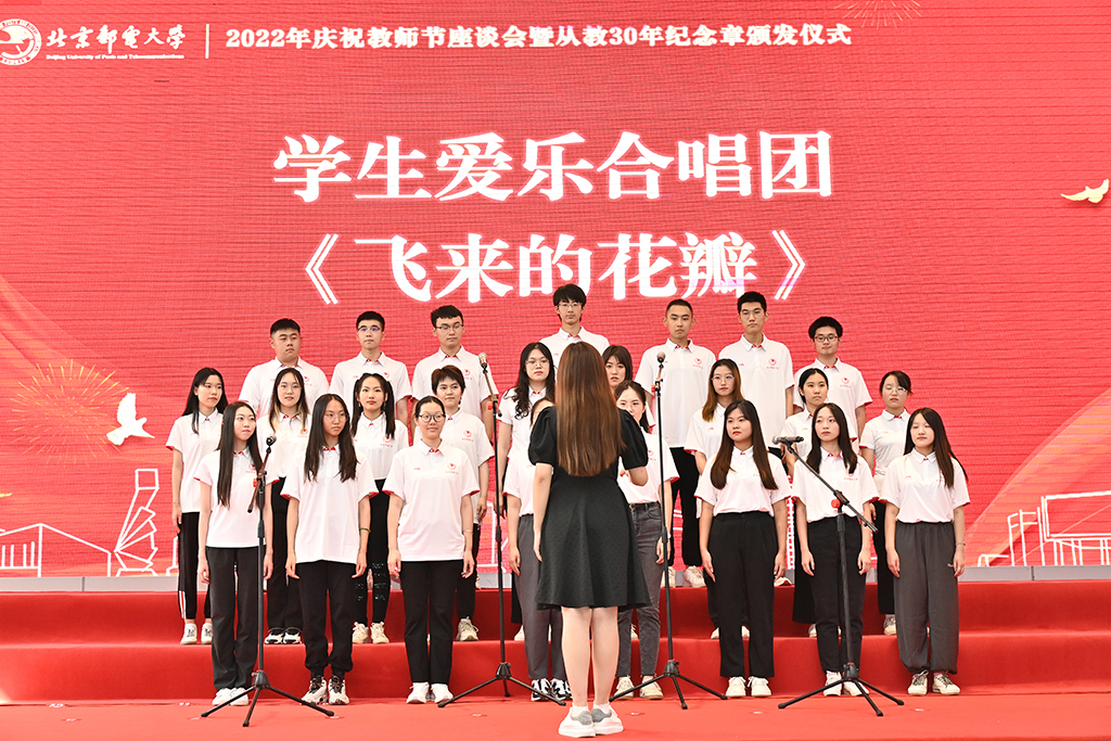 座谈会在视频《师者》中拉开序幕,视频从师生两个角度诠释了对“大先生”的理解,奔赴在五湖四海的外派老师带来远方的祝福;伴随着一张张北邮影像浮现,离退休教师代表带来的诗朗诵《我们也曾年轻》感动全场;学生爱乐合唱团以一首《飞来的花瓣》为敬爱的老师们献上真挚的祝福。