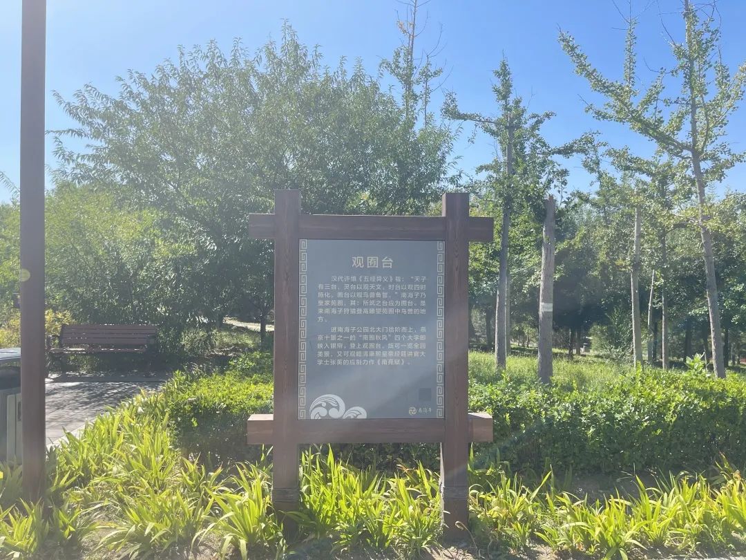 “《南海子图》上明确标明南海子至少有九座囿台,但它们现在都很难寻见,为了让更多的人了解南海子文化,我们将很多经典遗址‘请’进了南海子公园,这里就是历史上南海子的‘微缩版’。”张友才说,将南海子历史文化植入南海子公园,是为重新呈现“南囿秋风”这一景观。站在观囿台,登高远眺,可一览南海子公园二期美景。初秋时节,尽管没有期待中的层林尽染,但是凉风吹过,好不惬意。从观囿台走下没多远就是册妃台。传说顺治十三年(1656年),在南海子旧衙门行宫举行了册封董鄂氏为皇贵妃的册妃大典。除了晾鹰台、观囿台、册妃台以外,园内还设有望围台、麋角台、宝鼎台、救驾台、海青台、古秀台共计9个高台,每一个高台背后都有一段精彩的故事,也构成了“九台环碧”的景观,继承了“南囿秋风”的历史文脉。此外,公园二期还建成了神游清旷(亲水广场)、景湛清华(滨水广场)两处景观。据统计,南海子公园二期建成后,整个南海子公园总面积达到8.01平方公里,种植乔灌木约53万株,地被植物400余万平方米,水生植物约14万平方米,成为南城地区目前屈指可数的“绿肺”。