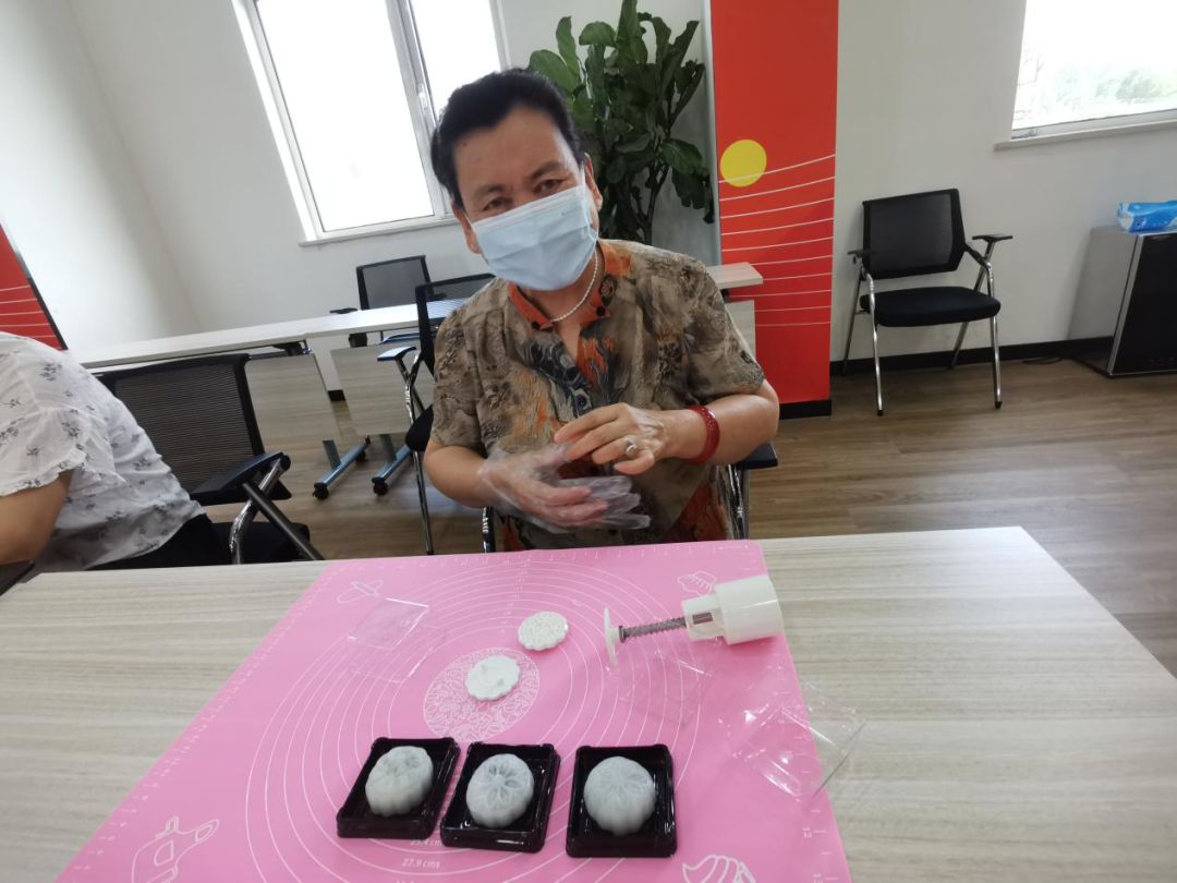 现场,青年汇社工为居民介绍冰皮月饼的制作方法,并带领大家亲手制作。通过揉皮、加馅、压模等工序,不一会儿一个个带有各式花纹的小月饼就新鲜出炉了。