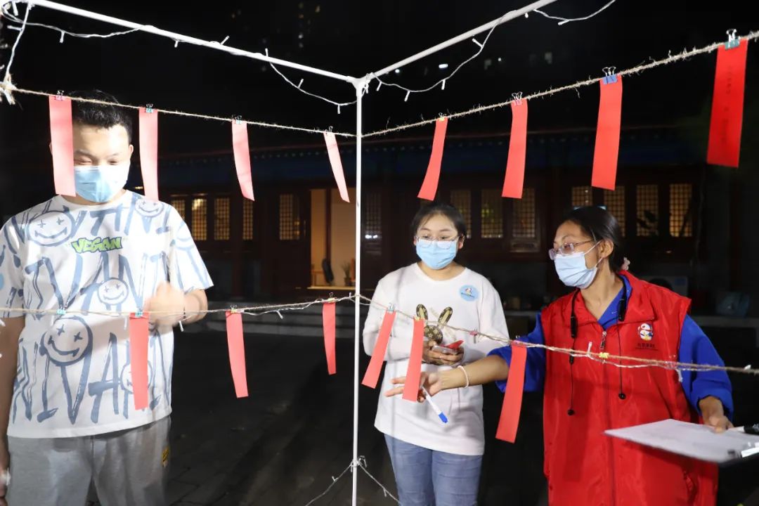 猜灯谜环节也是热火朝天的场面,大家在挂满了灯谜的架子前迅速但有序地穿梭,思索着探寻谜底。