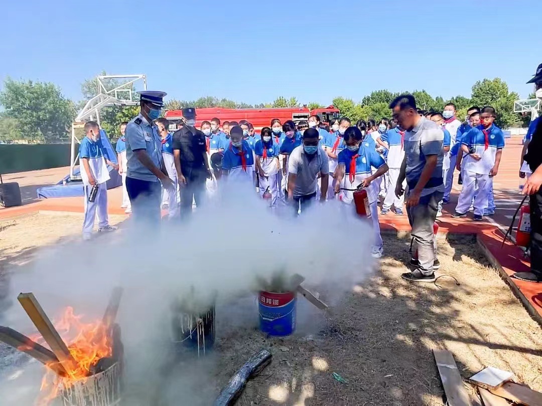 在学校操场上,消防宣讲员认真地讲解着“实践课”——灭火器的使用方法,同学们兴致盎然,踊跃参加。“提、拔、握、压。记住这个口诀就能很好的使用灭火器。在火灾的上风方向灭火才能更有利于保护我们自己。”在实战灭火环节,副校长带领着教官们一边演示如何正确使用灭火器扑灭明火,一边提醒大家记住灭火的要点。