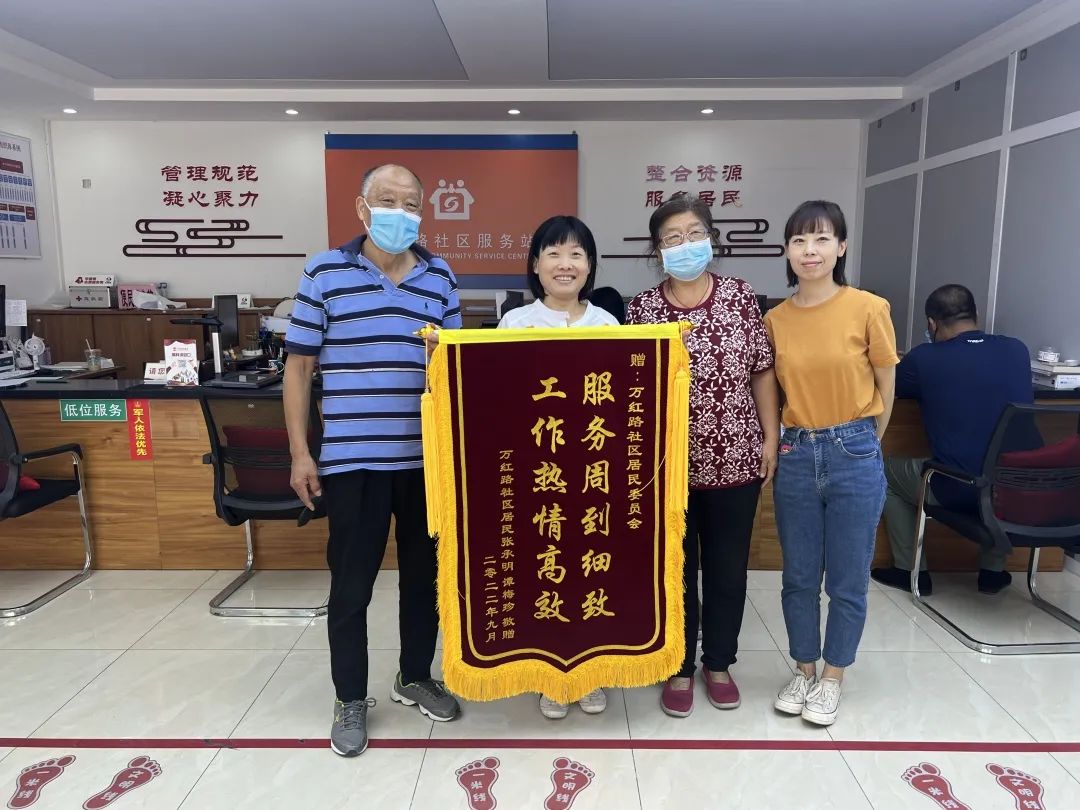 近日,万红路社区酒北村居民谭阿姨代表小区居民给社区送来了一面写着“服务周到细致 工作热情高效”的锦旗,对酒北村环境改造工作表示感谢。谭阿姨表示,在街道、社区、居民群众的共同努力下,这里的路平了、灯亮了、环境新了……酒北村变成了环境优美、生活宜居、邻里和谐的小区,收获了大家的一致好评。
