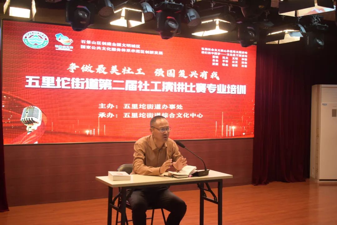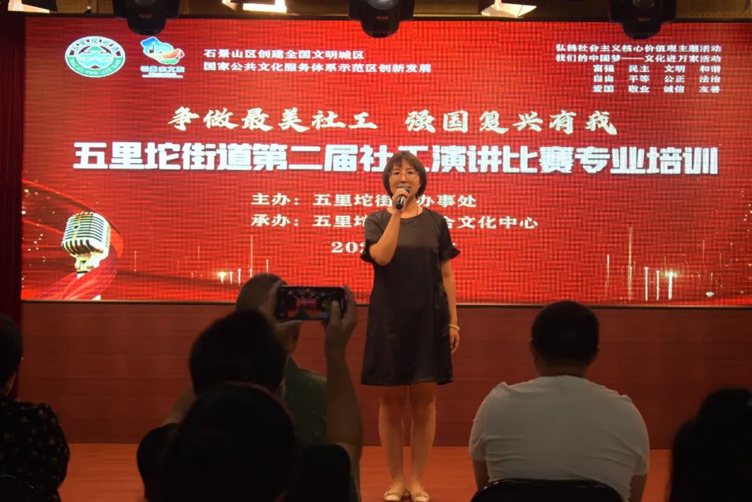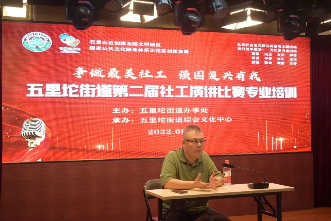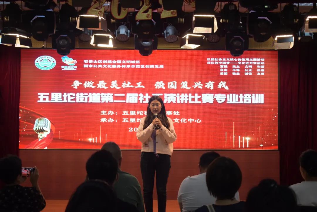 讲述一段段暖心社区故事,点亮一颗颗扎根基层真心。为提高社工队伍综合素质,锻炼语言表达能力,激发工作热情,凝心聚力干事创业注入精神动力,大力营造喜迎二十大的浓厚氛围,9月5日一天,五里坨街道“争做最美社工 强国复兴有我”第二届社工演讲比赛业务培训会在街道综合文化中心四楼多功能厅举办,街道韩娜副主任到会观摩指导。