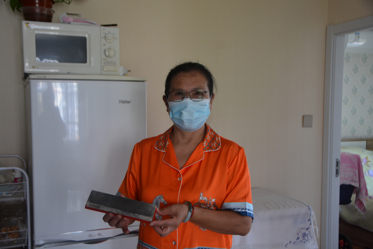 刘女士告诉申昊昕,社区工作人员为居民免费磨刀使用的磨刀石太细了,打磨效率不高,自己家有块比较粗的磨刀石更适合磨刀,可以借给社区用。