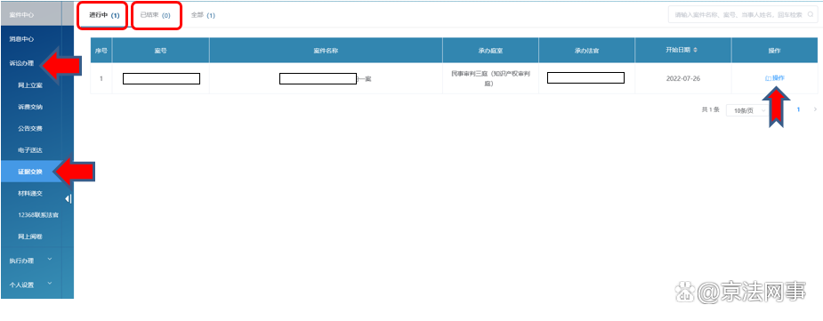 选取左侧列表中“诉讼办理”栏目,选取下级菜单中“证据交换”选项,即可进入到证据交换系统的功能界面。当事人和代理人可以看见自己参与案件中正在进行证据交换的案件以及已经结束证据交换的案件。点击对应案件“操作”按钮,即可进行举证质证。