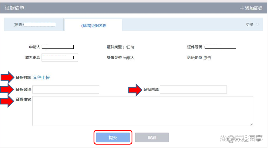 🔷如不上传文件,则不会显示“证据名称”,“证据来源”,“证据事实”信息项,无需填写。