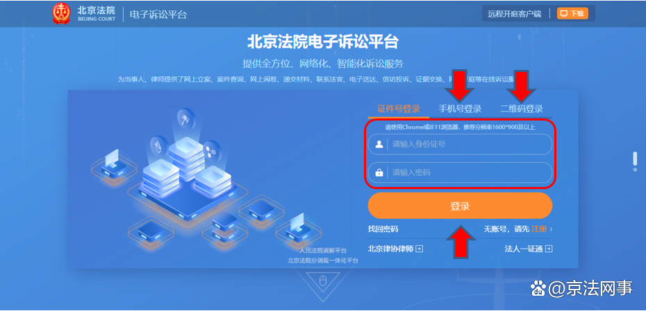 打开浏览器,搜索“北京法院电子诉讼平台”或者直接输入网址“http://www.sspt.bjcourt.gov.cn”,输入账号密码,点击“登录”,也可以选择手机号登录或者二维码登录方式。