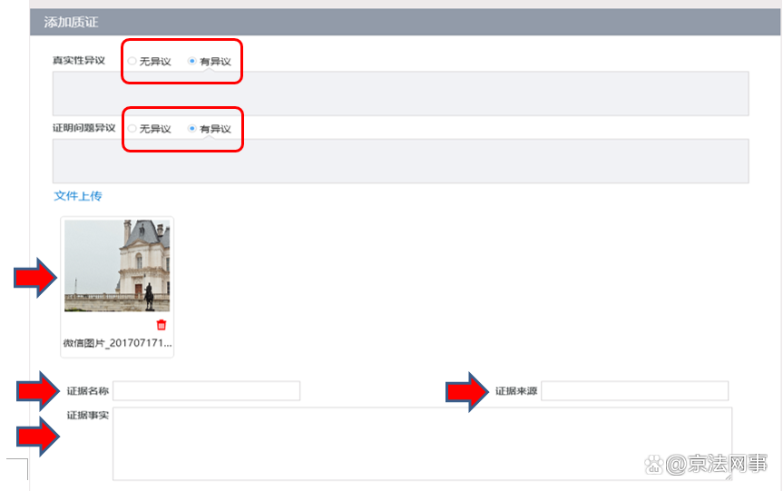 ➡如果对需质证的证据有异议,则勾选“有异议”后填写“异议原因”。同时,根据是否提交文件材料佐证质证意见分别处理: